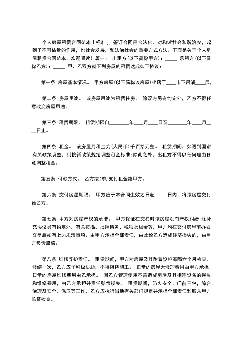 个人房屋租赁合同范本「标准」 签订合同是合法化,对和谐社会和谐治安,起到了不可估量的作用,也社会发展,和法治社会的重要方式方法。下面是关于个人房屋租赁合同范本,欢迎阅读! 篇一: 出租方(以下简称甲方):_____ 承租方(以下简称乙方):_____ 甲、乙双方就下列房屋的租赁达成如下协议: