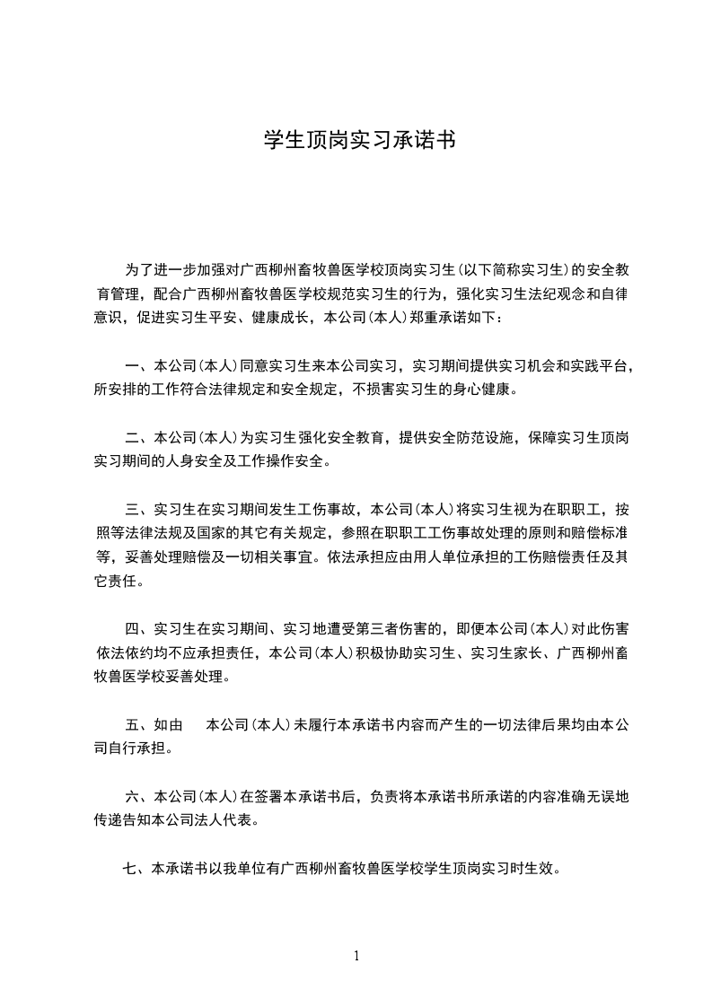 为了进一步加强对广西柳州畜牧兽医学校顶岗实习生(以下简称实习生)的安全教育管理,配合广西柳州畜牧兽医学校规范实习生的行为,强化实习生法纪观念和自律意识,促进实习生平安、健康成长,本公司(本人)郑重承诺如下: