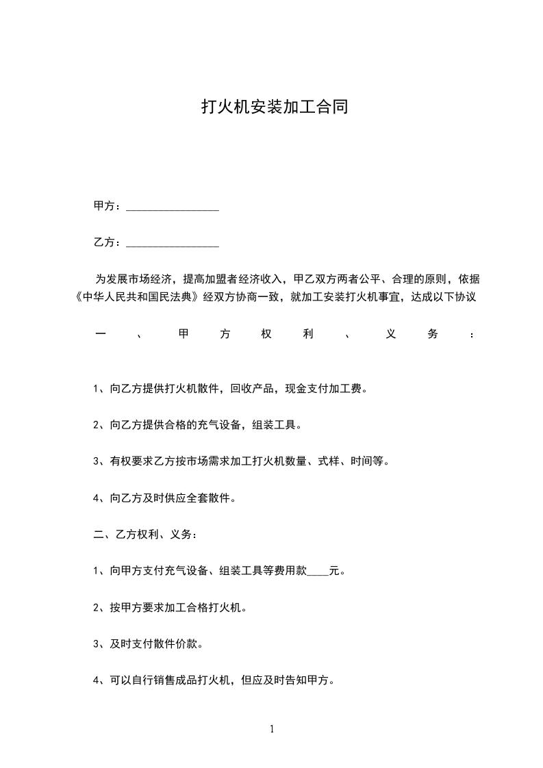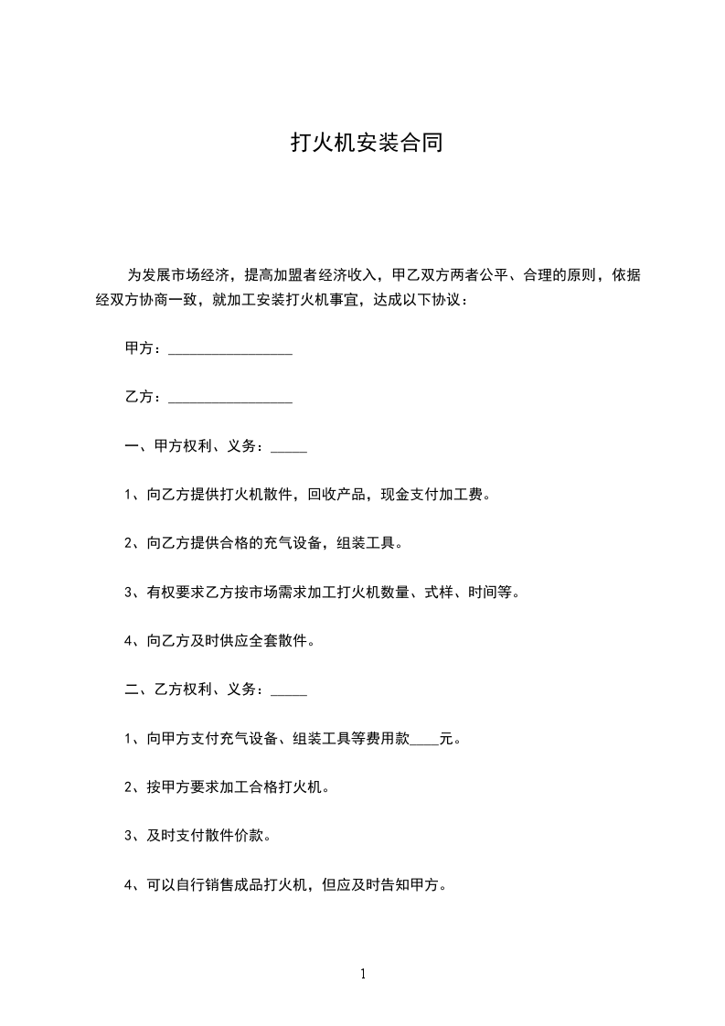 为发展市场经济,提高加盟者经济收入,甲乙双方两者公平、合理的原则,依据 经双方协商一致,就加工安装打火机事宜,达成以下协议: