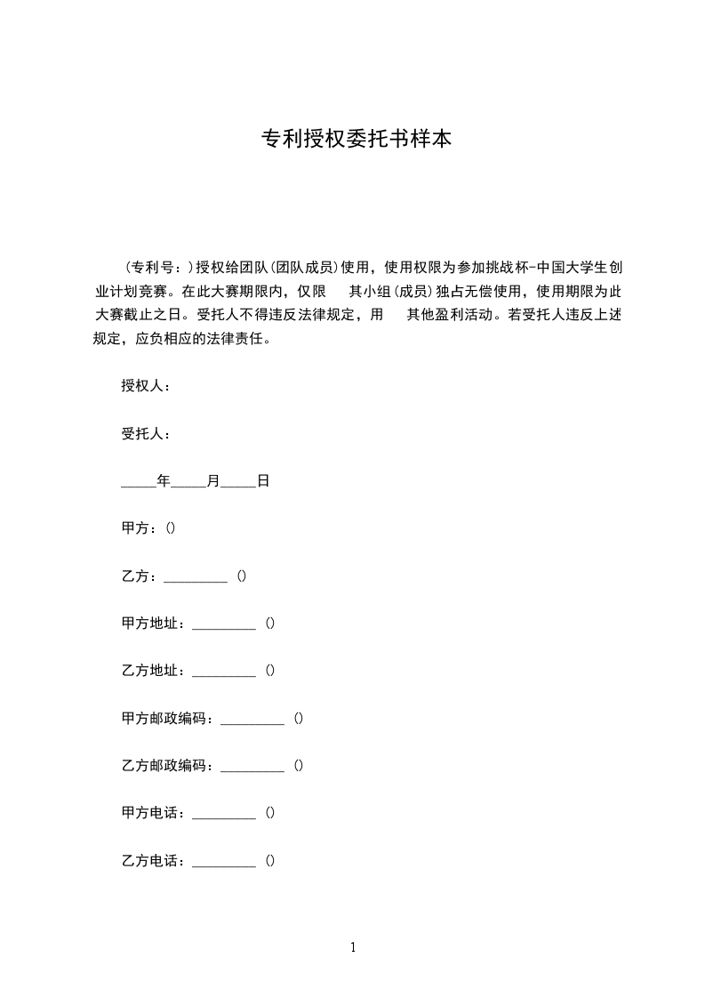 (专利号:)授权给团队(团队成员)使用,使用权限为参加挑战杯-中国大学生创业计划竞赛。在此大赛期限内,仅限 其小组(成员)独占无偿使用,使用期限为此大赛截止之日。受托人不得违反法律规定,用 其他盈利活动。若受托人违反上述规定,应负相应的法律责任。