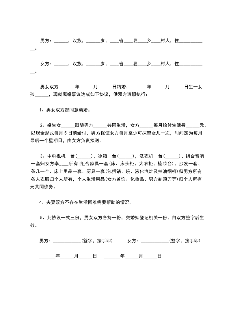 男女双方_______年______月______日结婚,_______年______月______日生一女孩______,现就离婚事议达成如下协议,供双方遵照执行: