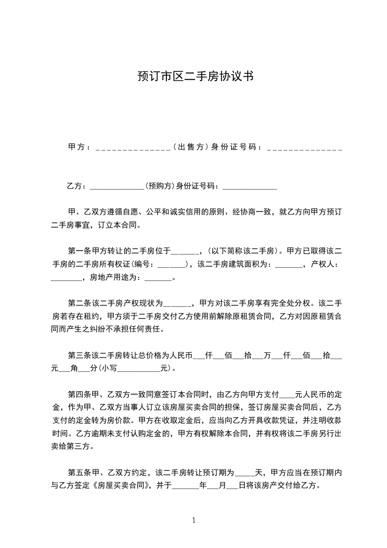 第五条甲、乙双方约定,该二手房转让预订期为_____天,甲方应当在预订期内与乙方签定《房屋买卖合同》,并 _____年___月___日将该房产交付给乙方。