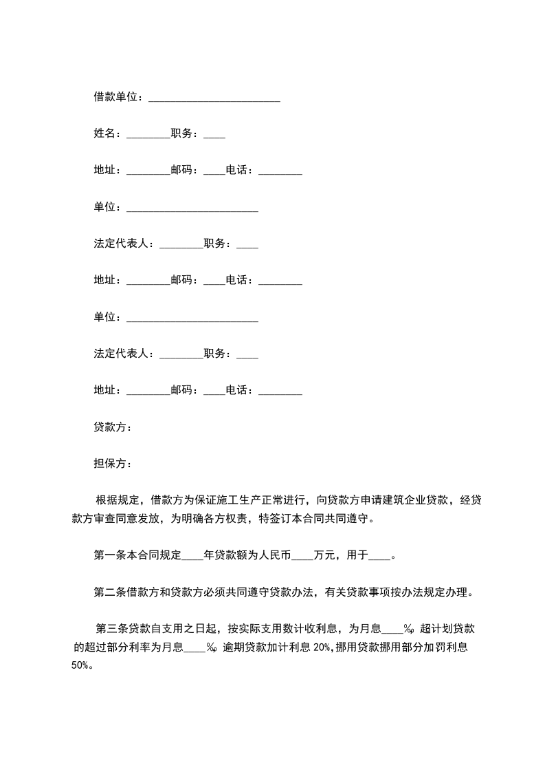 第一条 本合同规定____ 年贷款额为人民币(大写)____ 万元,用 ____ 。