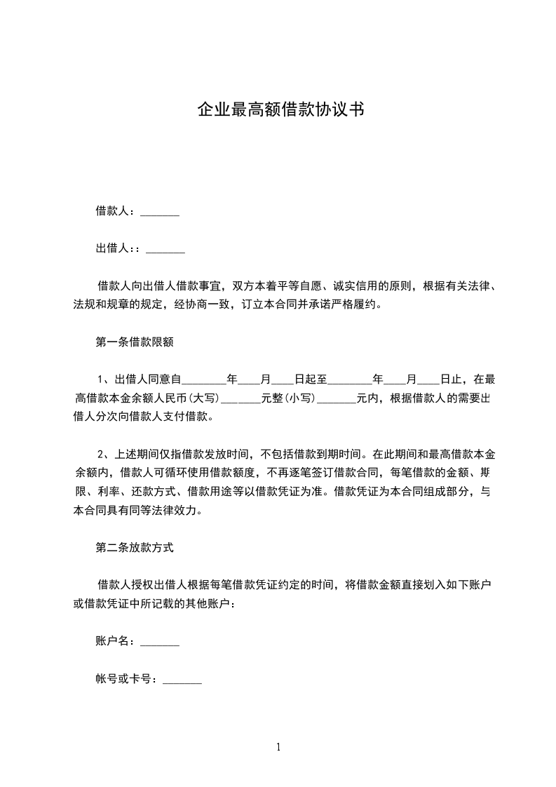 一、借款最高金额:甲方同意借给乙方借款余额最高(人民币)万元,大写(人民币)万元。实际借款金额和借款期限以借款借据为准。