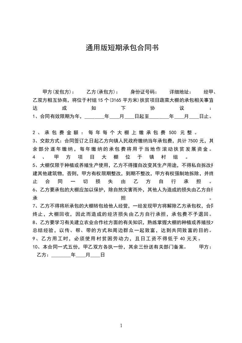 甲方(发包方): 乙方(承包方): 身份证号码: 详细地址: 经甲、乙双方相互协商,将位于村组15个(3165平方米)扶贫项目蔬菜大棚的承包相关事宜达成如下协议: