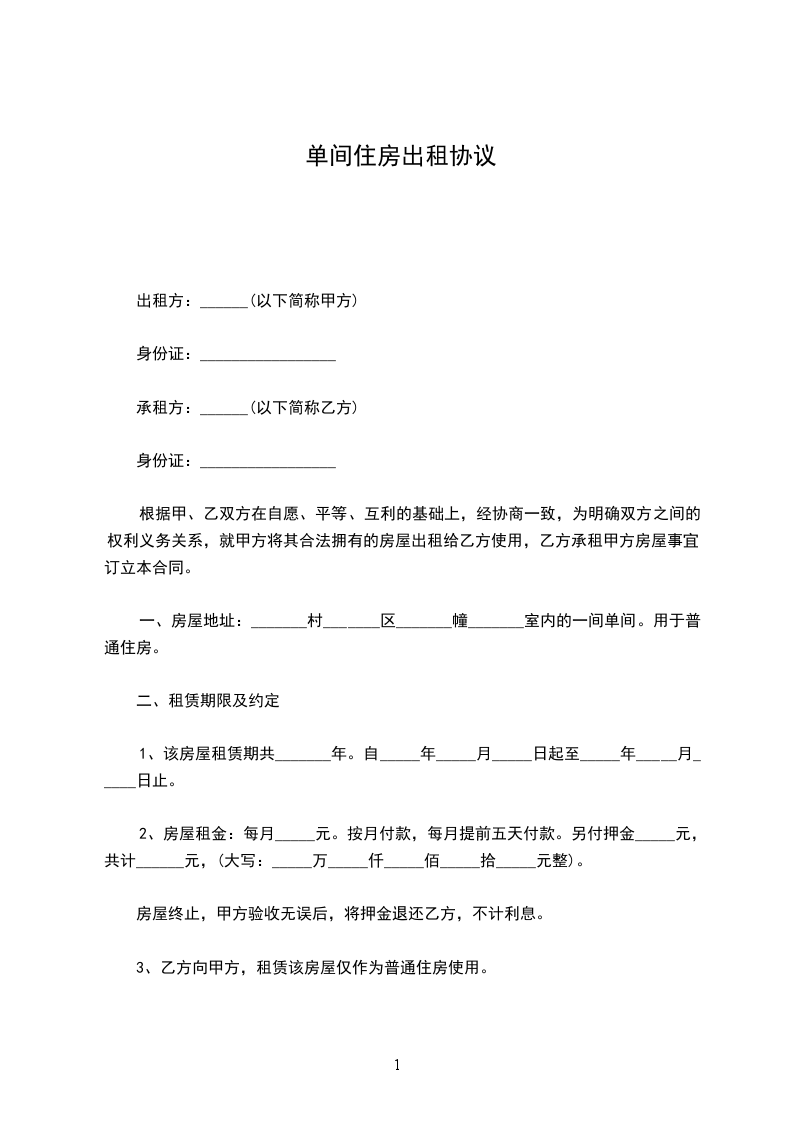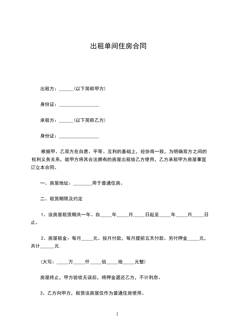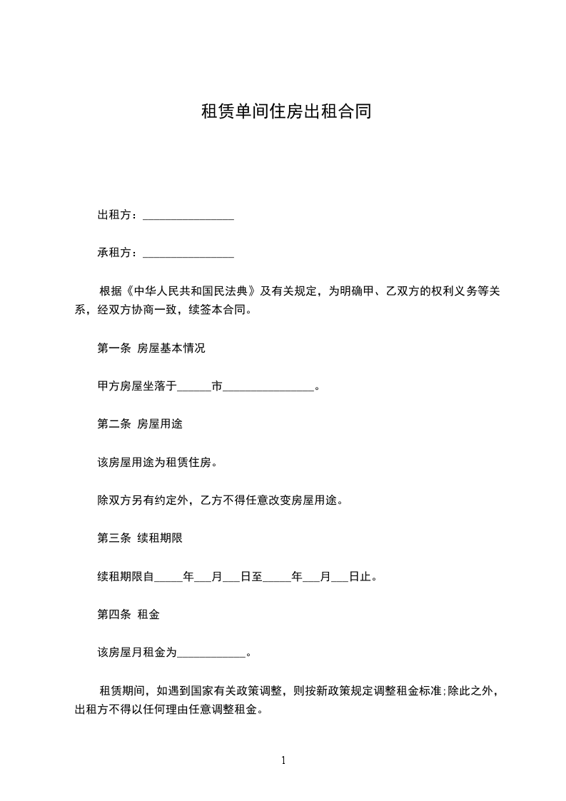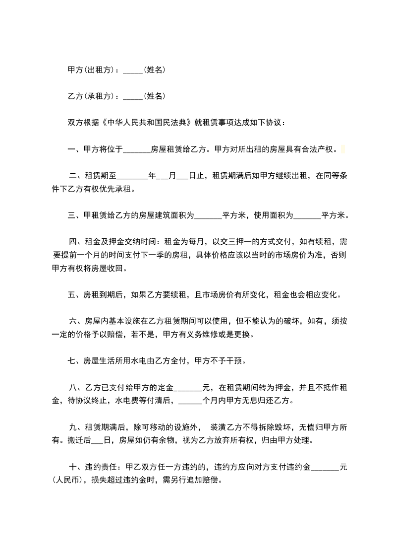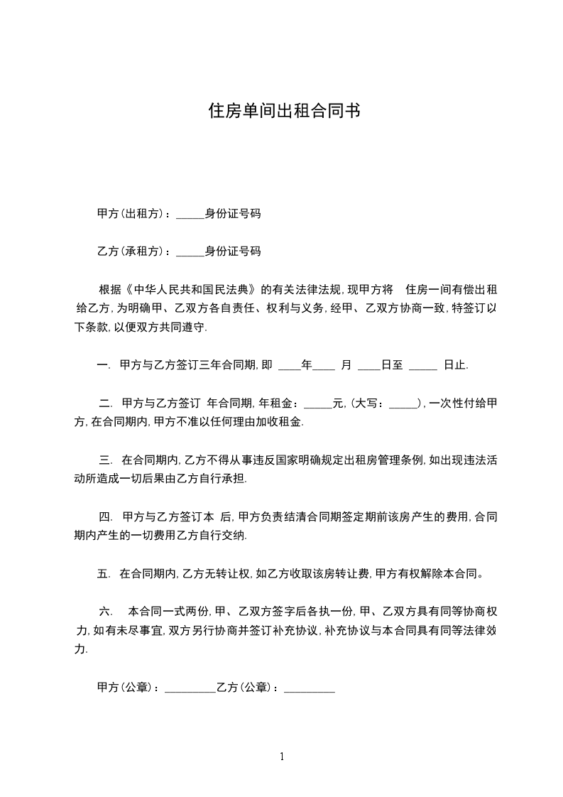 根据《中华人民共和国民法典》的有关法律法规,现甲方将 住房一间有偿出租给乙方,为明确甲、乙双方各自责任、权利与义务,经甲、乙双方协商一致,特签订以下条款,以便双方共同遵守.