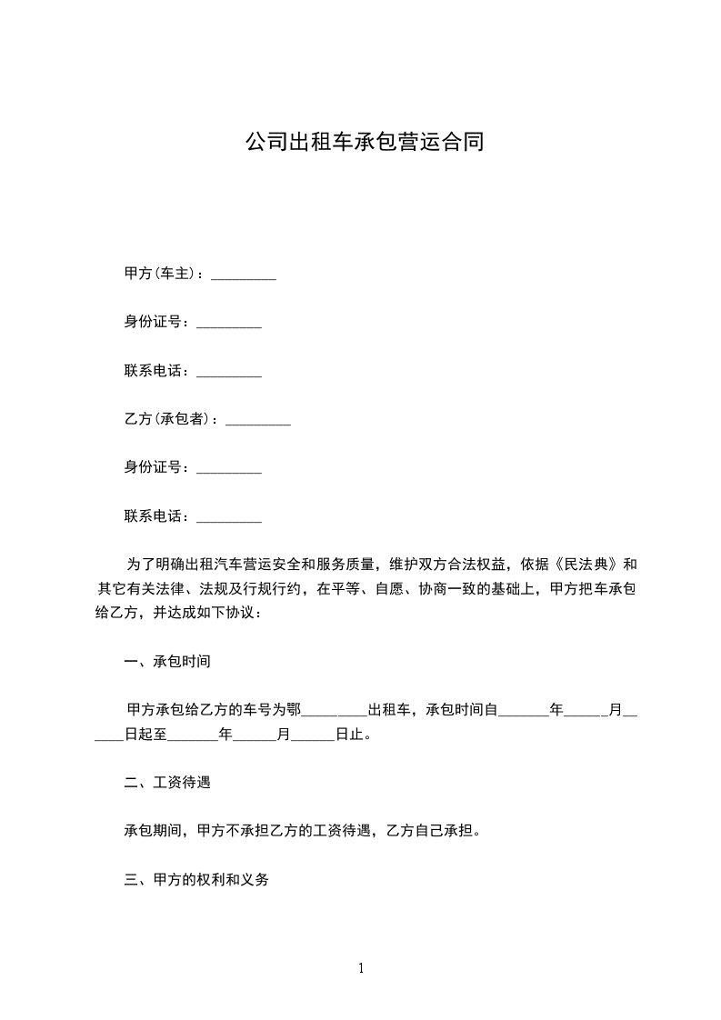 为了明确出租汽车营运安全和服务质量,维护双方合法权益,依据《民法典》和其它有关法律、法规及行规行约,在平等、自愿、协商一致的基础上,甲方把车承包给乙方,并达成如下协议: