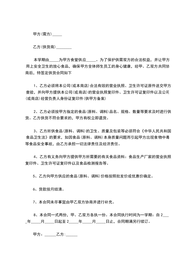 本学期由_____为甲方食堂供应_____。为了保护供需双方的合法权益,并让甲方用上安全卫生的放心食品,确保甲方全体师生员工的身心健康,经甲、乙双方共同协商后,特签定供货合同如下
