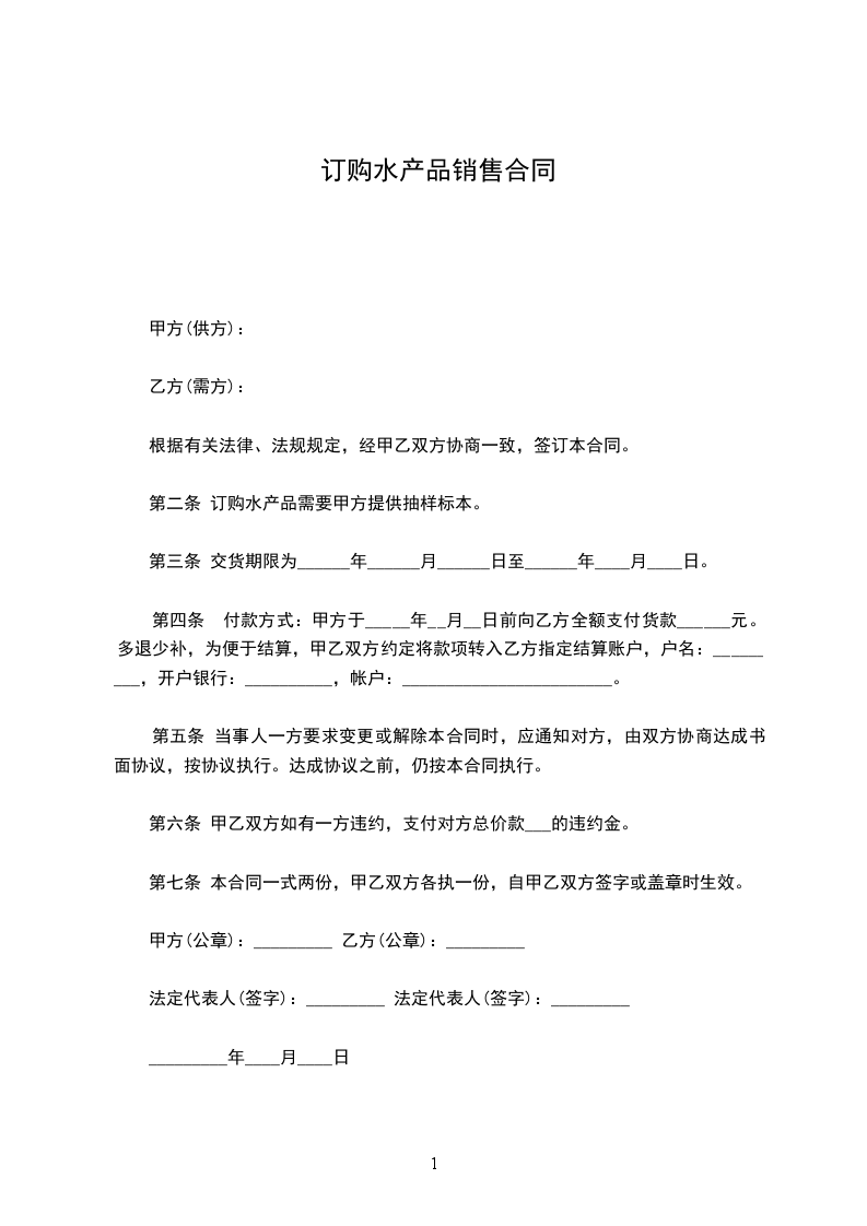 (一)甲方拒绝交付所订水产或乙方拒收所订水产品的按合同总价款的_____%,向另一方支付违约金。