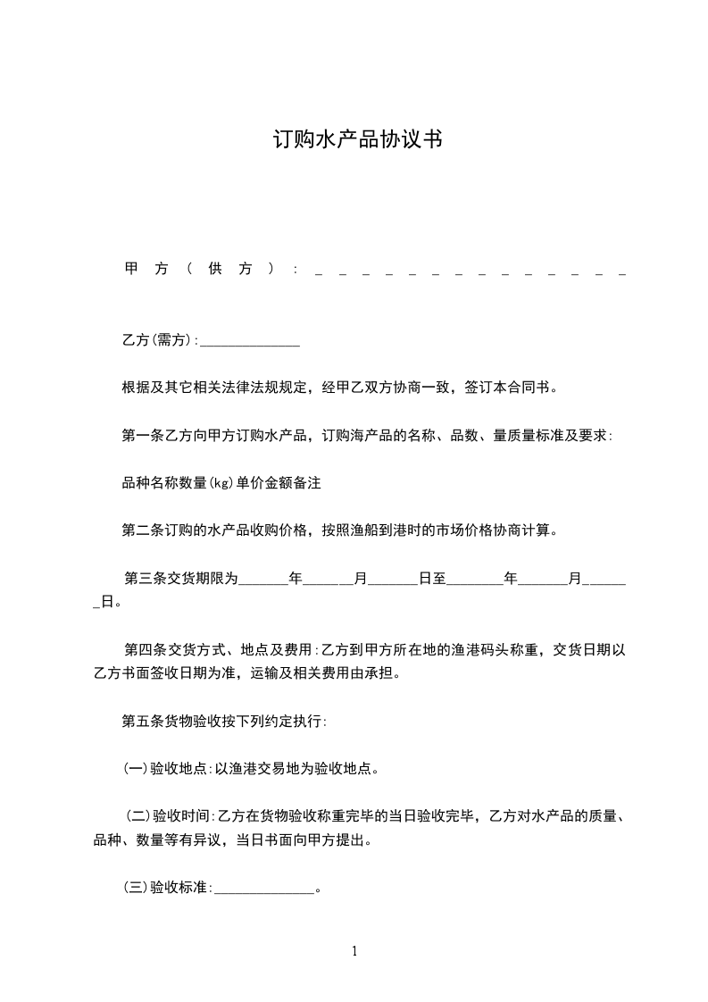 第一条乙方向甲方订购水产品,订购海产品的名称、品数、量质量标准及要求:品种名称数量()单价金额备注