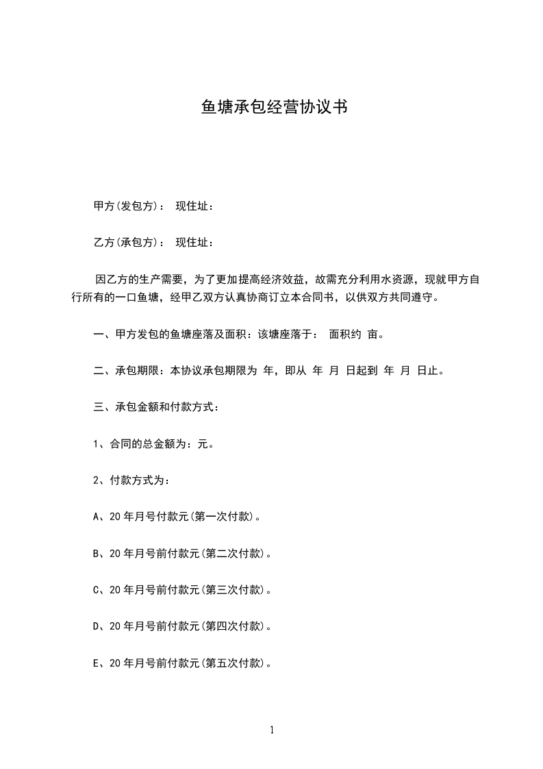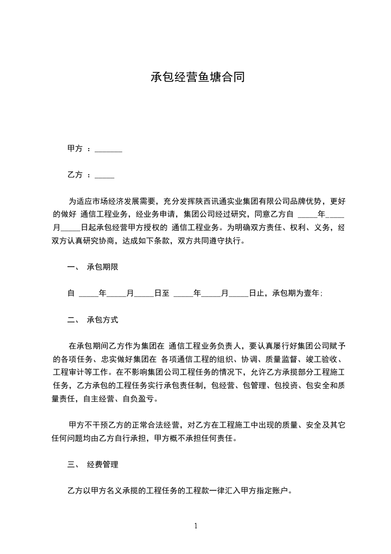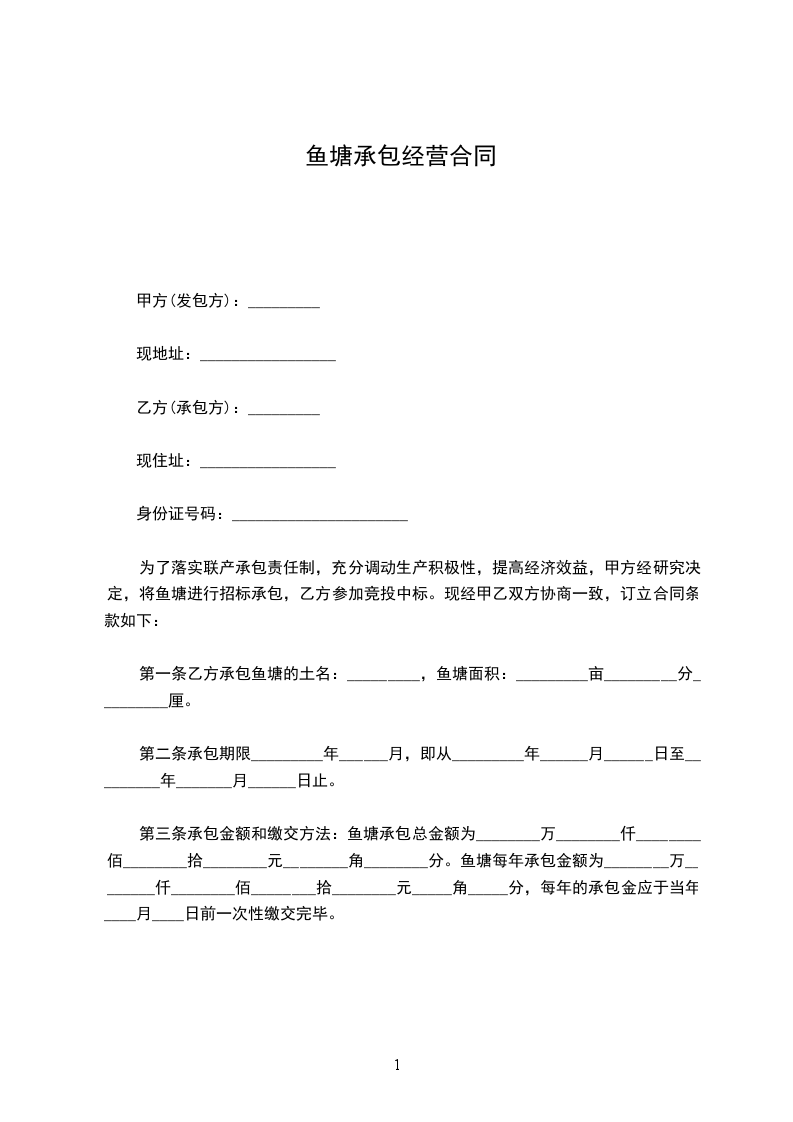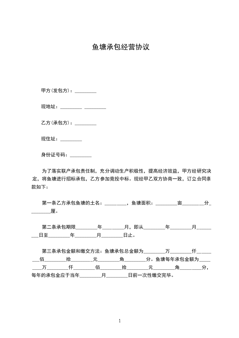 乙方通过与甲方协商的方式,取得甲方鱼塘的承包经营权,经双方共同商定,达成如下协议,特立此合同。