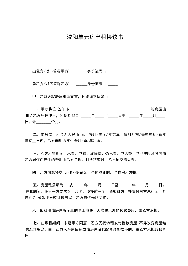 一、甲方将位 沈阳市__________________________________________的房屋出租给乙方居住使用,租赁期限自 _____年_____月_____日至 _____年_____月_____日,计________个月。