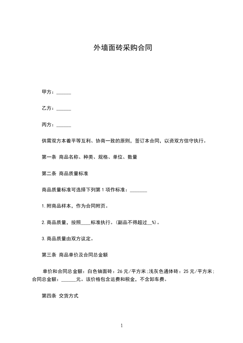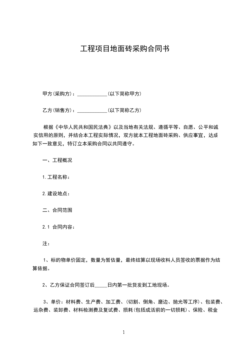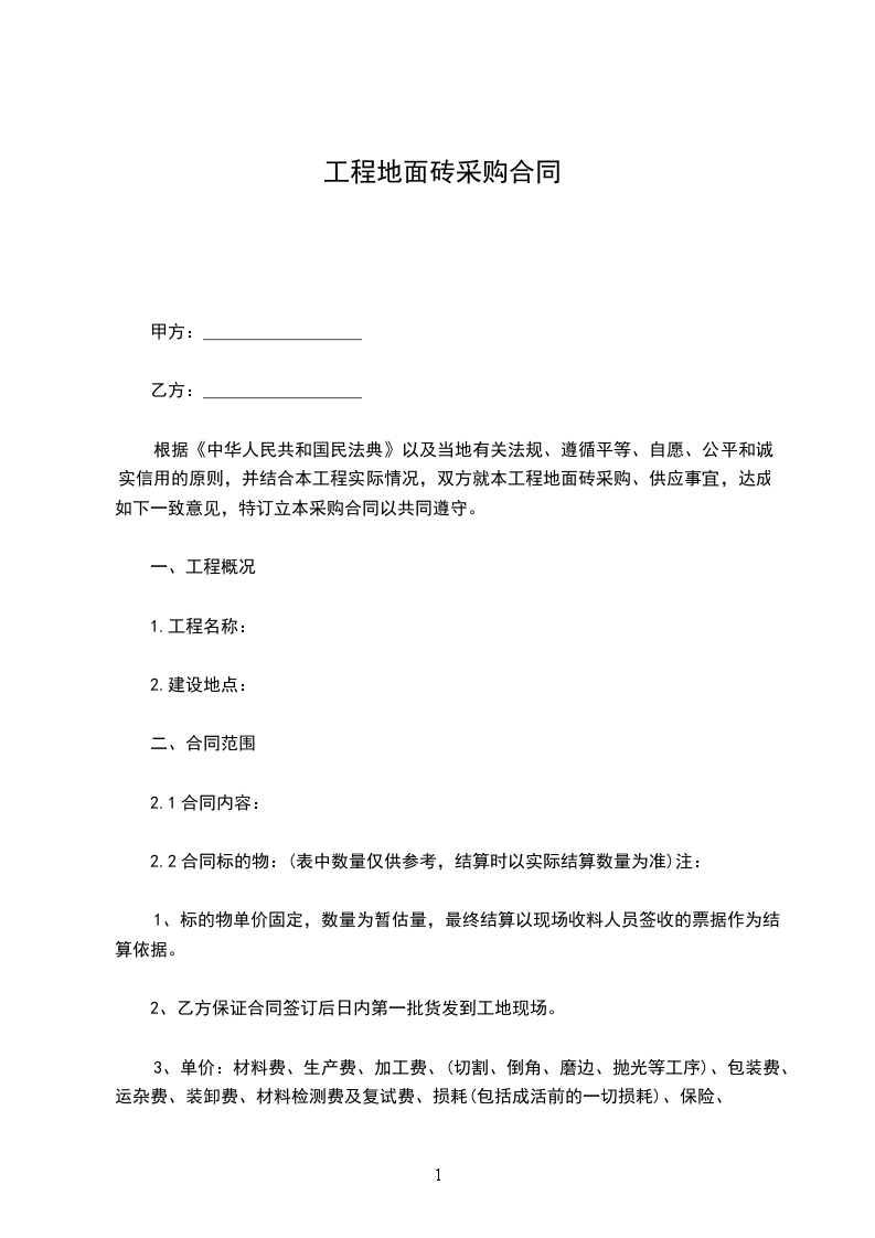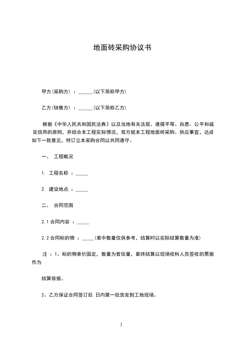 根据《中华人民共和国民法典》以及当地有关法规、遵循平等、自愿、公平和诚实信用的原则,并结合本工程实际情况,双方就本工程地面砖采购、供应事宜,达成如下一致意见,特订立本采购合同以共同遵守。