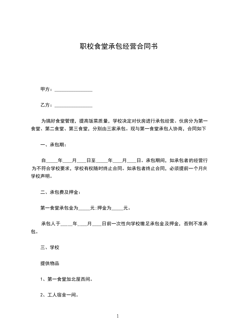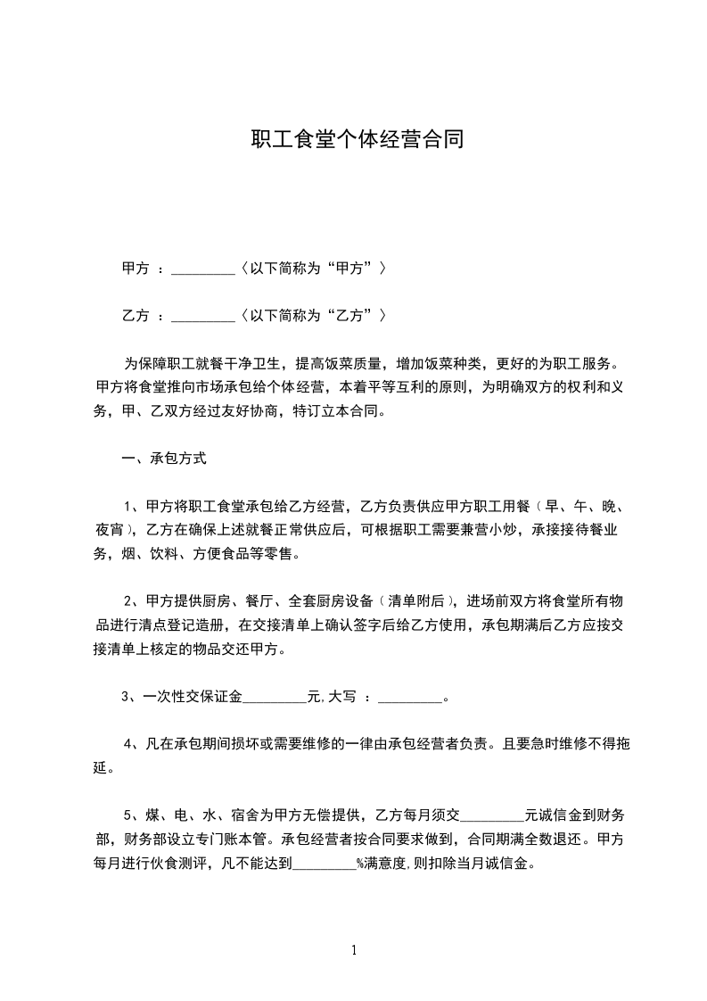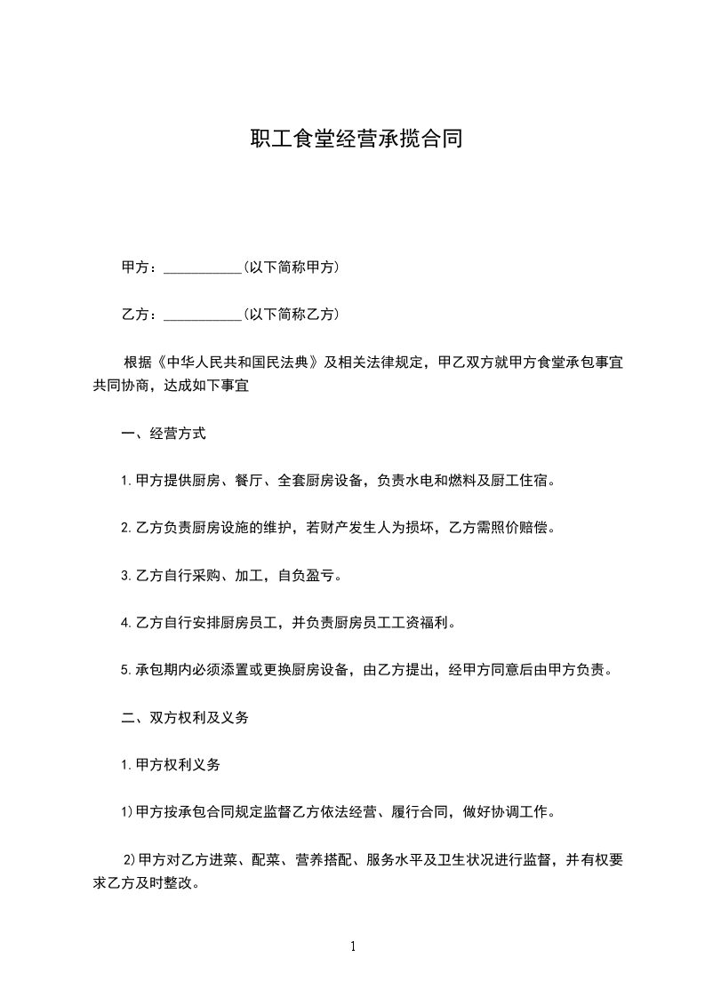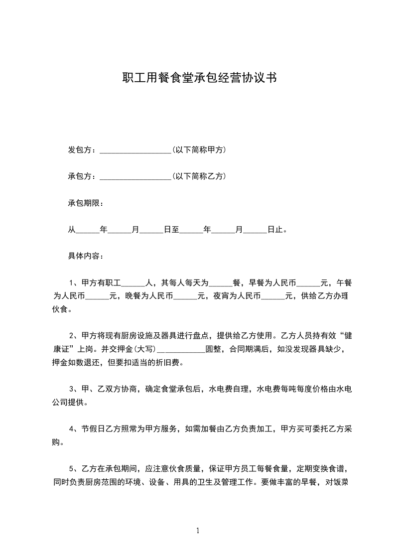 1、甲方有职工______人,其每人每天为______餐,早餐为人民币______元,午餐为人民币______元,晚餐为人民币______元,夜宵为人民币______元,供给乙方办理伙食。
