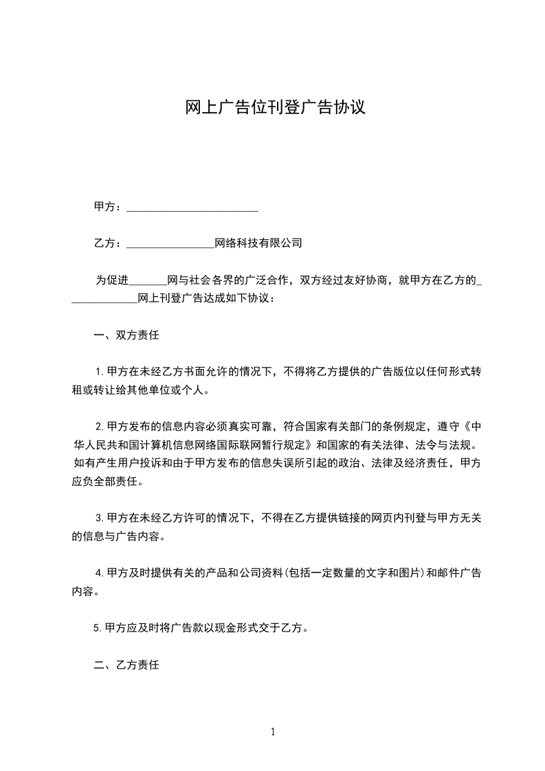 为促进_______网与社会各界的广泛合作,双方经过友好协商,就甲方在乙方的_____________网上刊登广告达成如下协议: