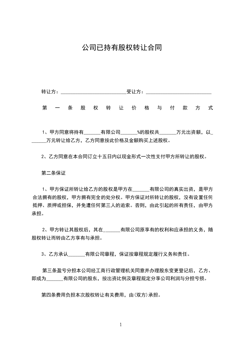 1、甲方同意将持有_______有限公司_______%的股权共_______万元出资额,以_______万元转让给乙方,乙方同意按此价格及金额购买上述股权。
