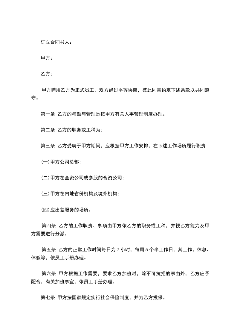 甲方聘用乙方为正式员工,双方经过平等协商,彼此同意约定下述条款以共同遵守。