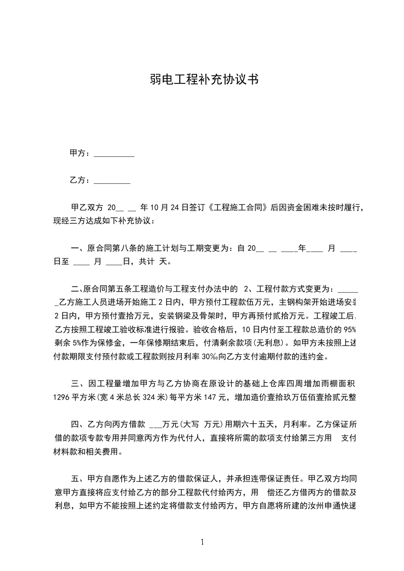 甲乙双方 20__ __ 年10月24日签订《工程施工合同》后因资金困难未按时履行,现经三方达成如下补充协议: