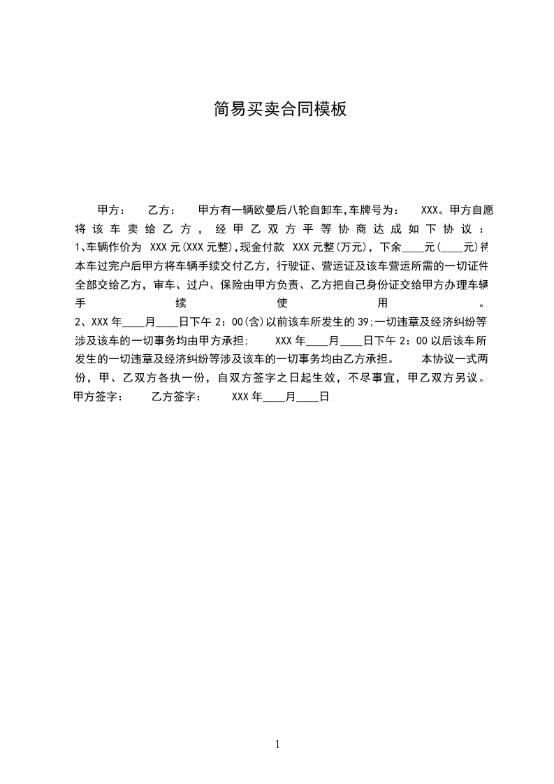 甲方: 乙方: 甲方有一辆欧曼后八轮自卸车,车牌号为:XXX。甲方自愿将该车卖给乙方,经甲乙双方平等协商达成如下协议:
