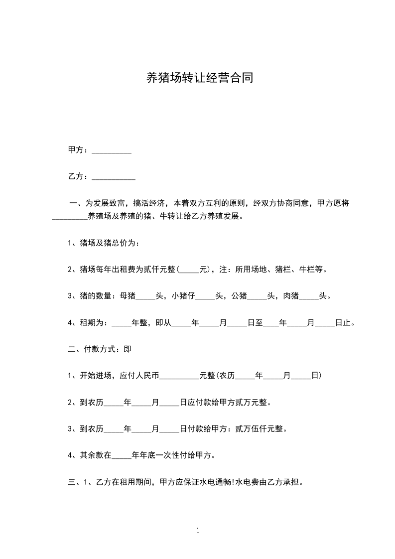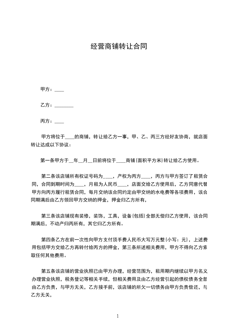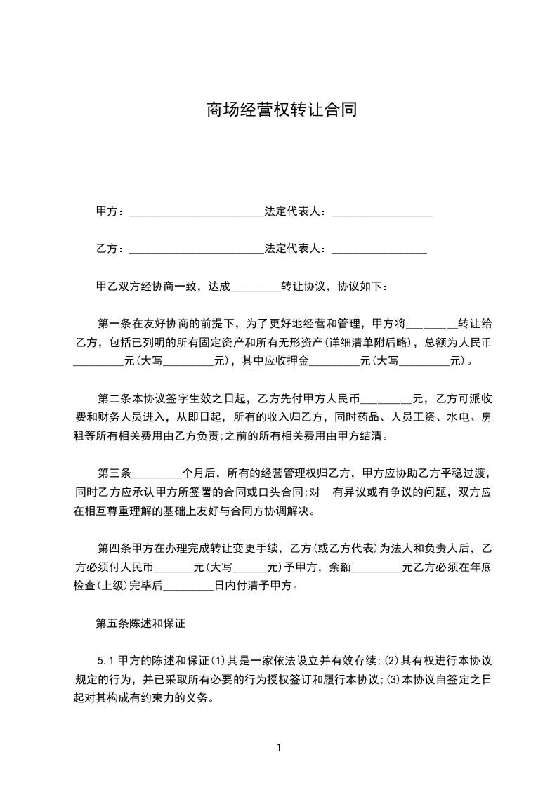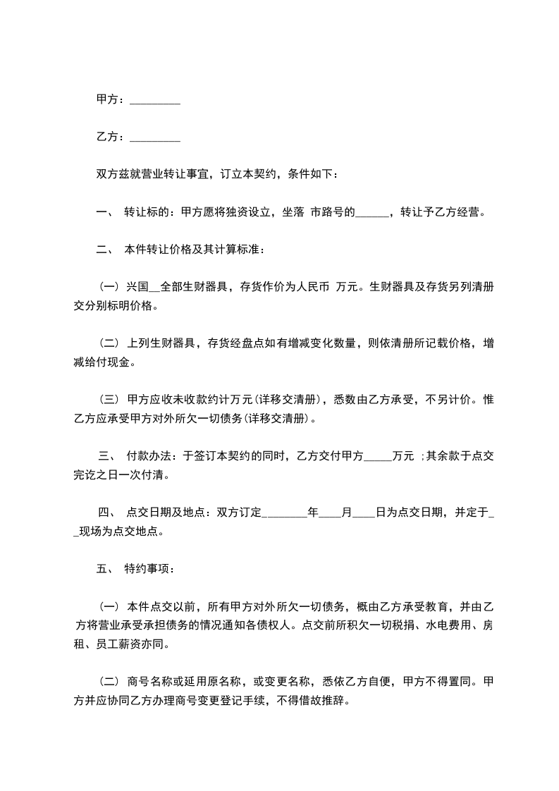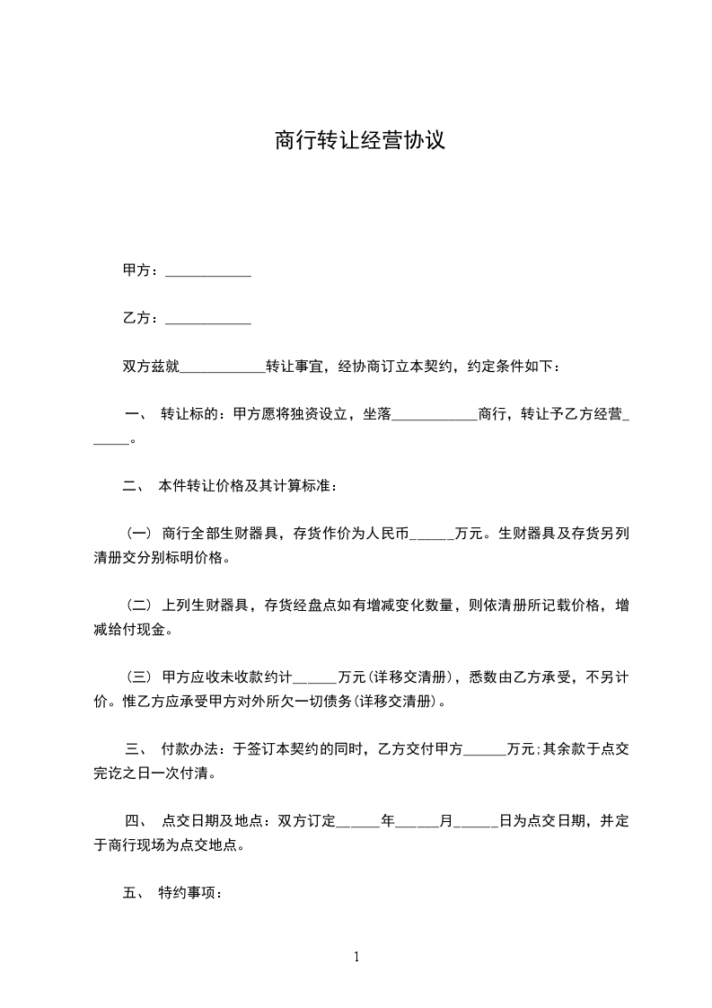 第一条在友好协商的前提下,为了更好地经营和管理,甲方将_________转让给乙方,包括已列明的所有固定资产和所有无形资产(详细清单附后略),总额为人民币_________元(大写_________元),其中应收押金_________元(大写_________元)。