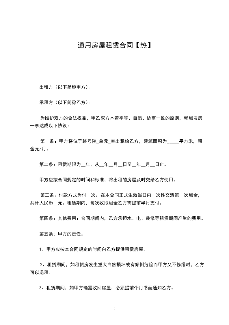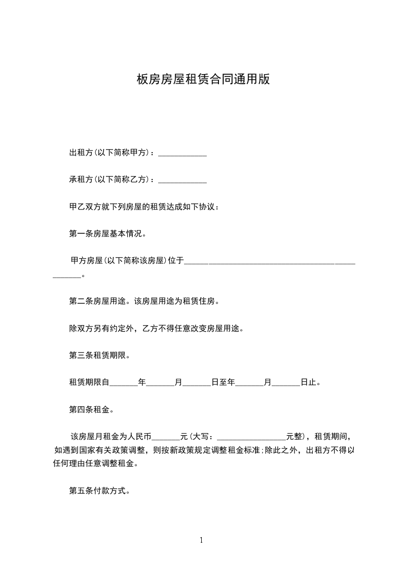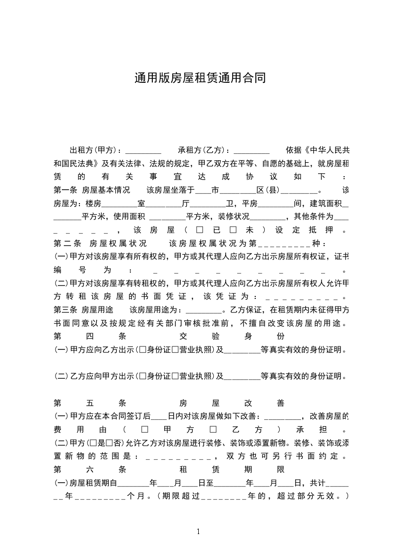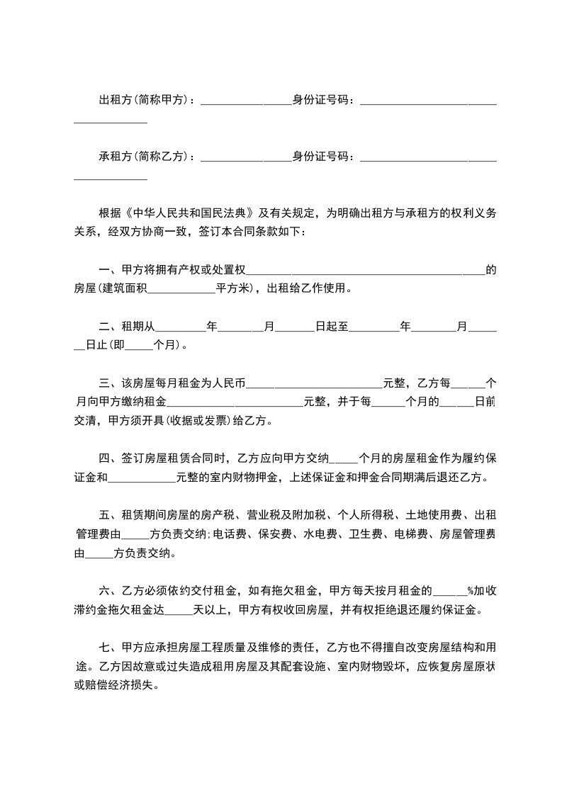 出租方(甲方):_________ 承租方(乙方):_________ 依据《中华人民共和国民法典》及有关法律、法规的规定,甲乙双方在平等、自愿的基础上,就房屋租赁的有关事宜达成协议如下: