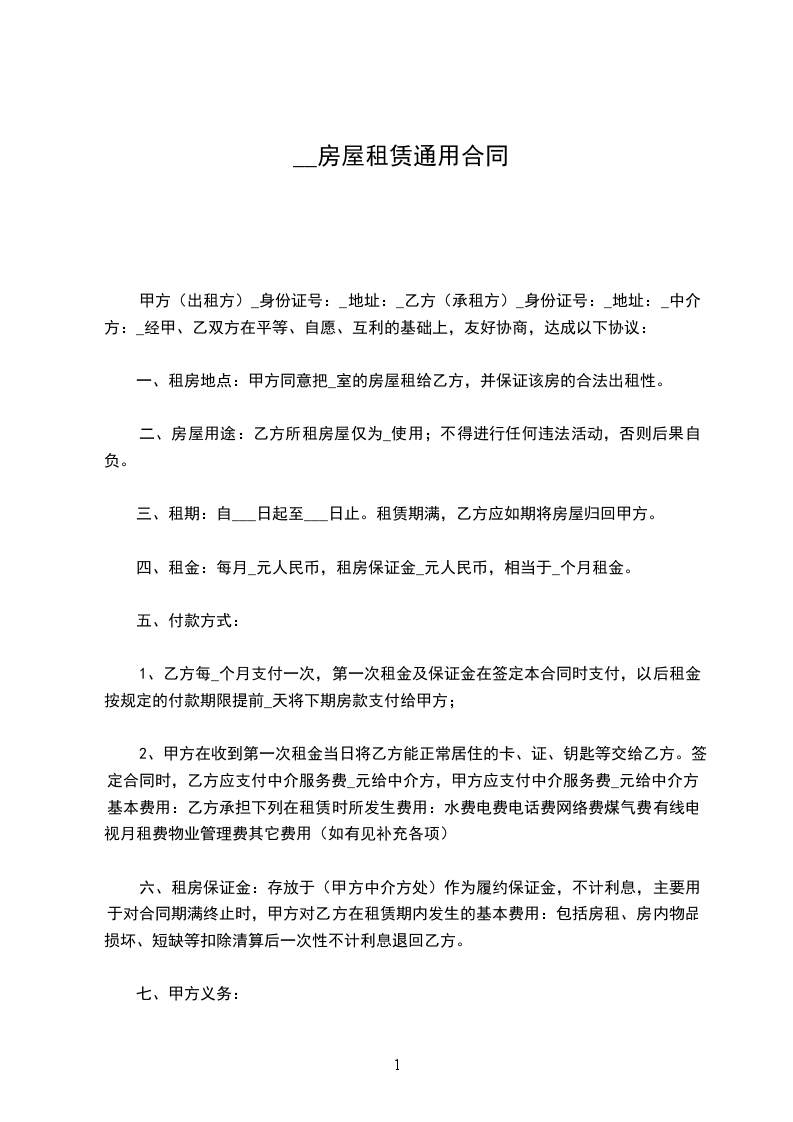 1、乙方每____月支付一次租金,并提前一个月支付下一期房屋租金,