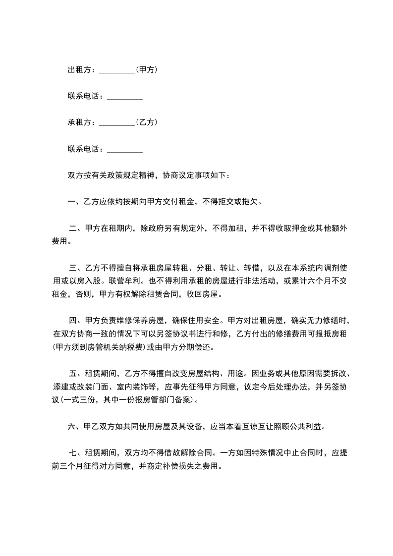 5、因不可抗力原因致使本合同不能继续履行的,甲、乙双方互不承担责任,造成损失的,则由双方各自承担;因国家政策需要拆除或改造已租赁的房屋,甲、乙双方互不承担责任,造成损失的,则由双方各自承担,租金、保证金按实结算。