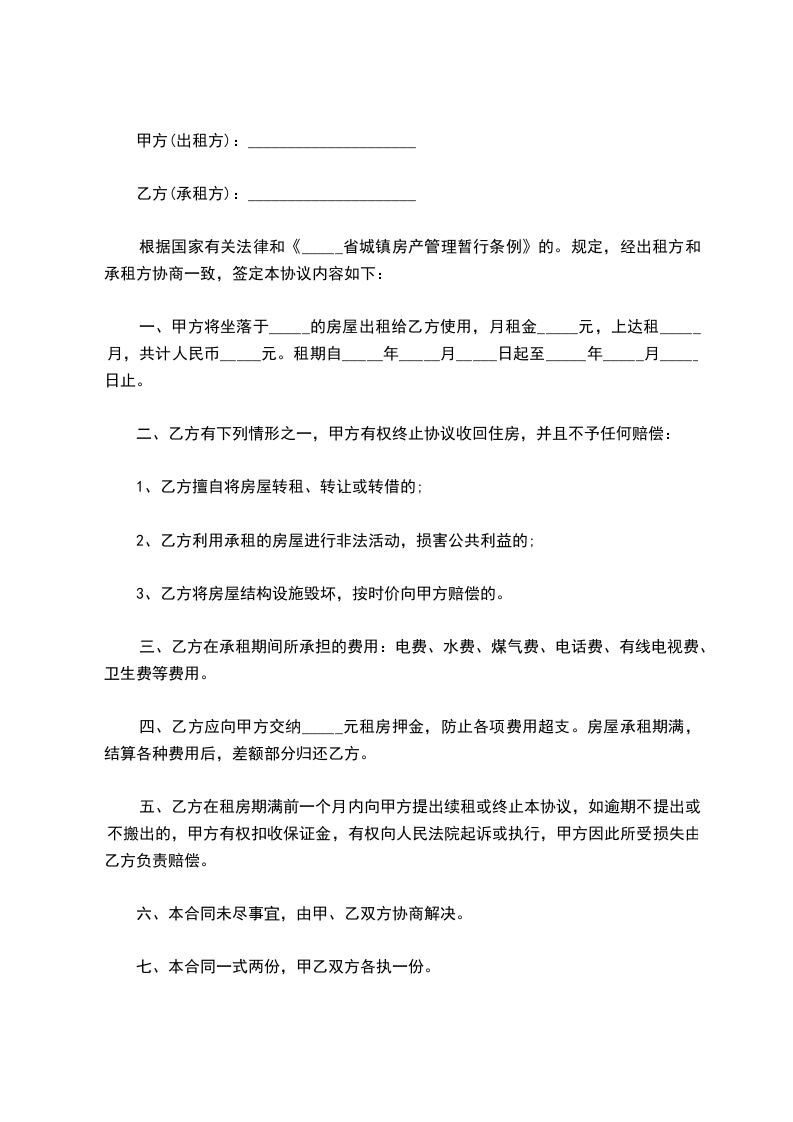 一、甲方同意将本人所属之坐落于________市________区________路________村(弄)________幢________室的房屋出租给乙方。房屋建筑面积________平方米,房屋所有权证编号:________________,国有土地使用权证编号:________________.甲方保证上述房屋出租的合法性,并为此承担相应的法律责任;乙方对上述房屋已经充分了解,愿意承租该房屋。