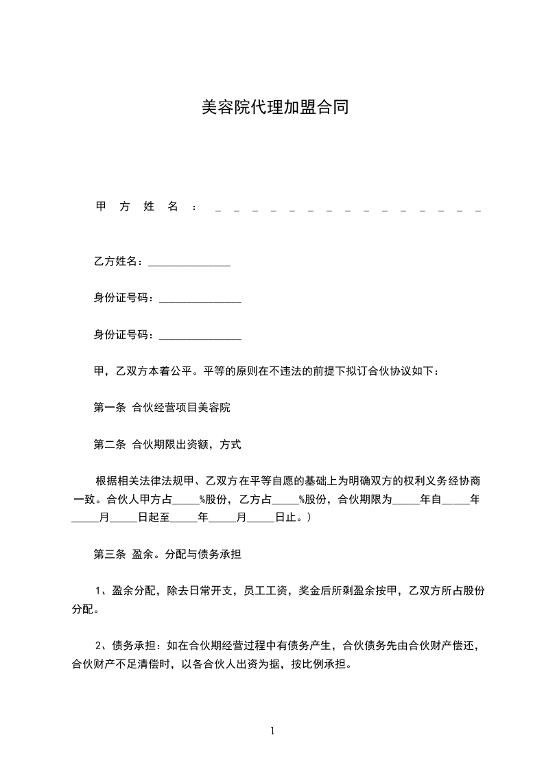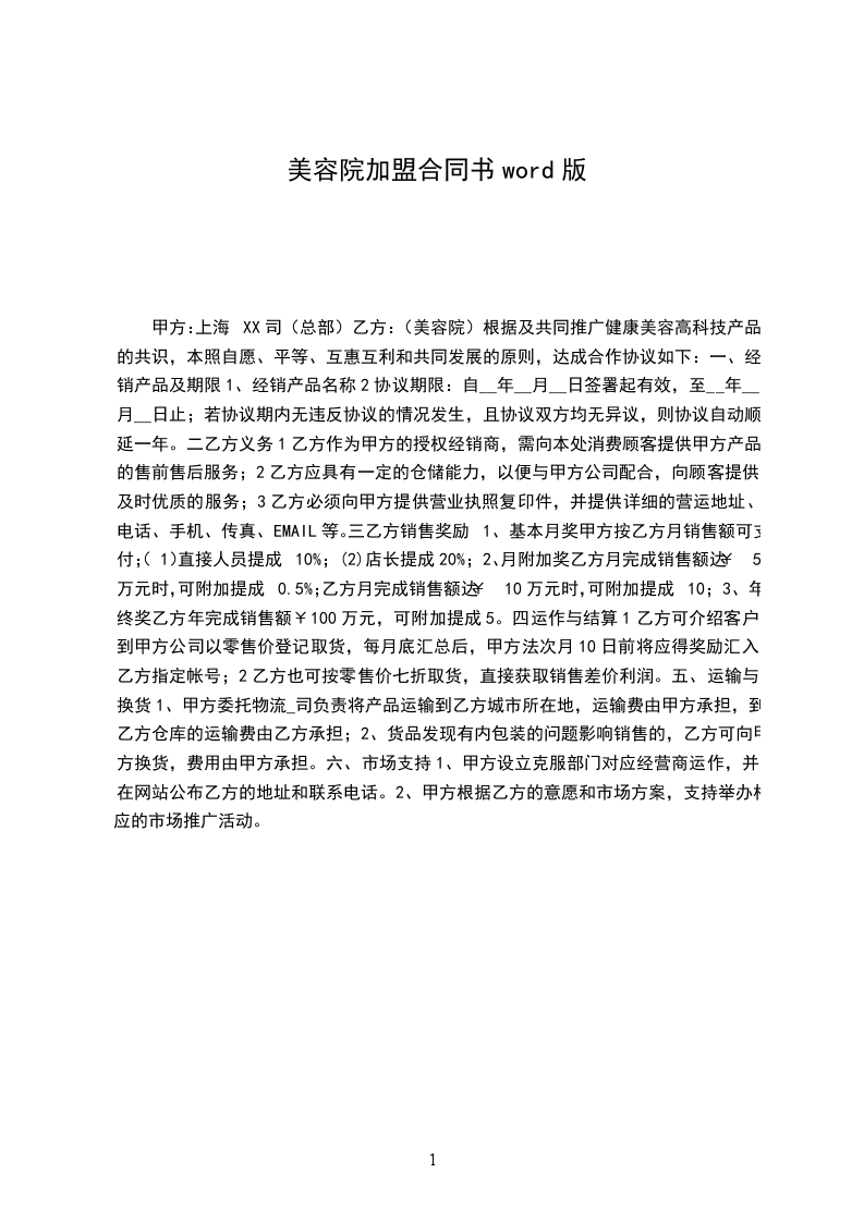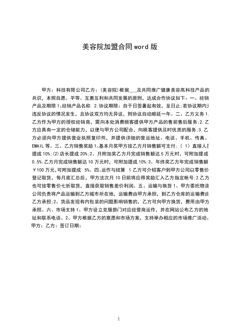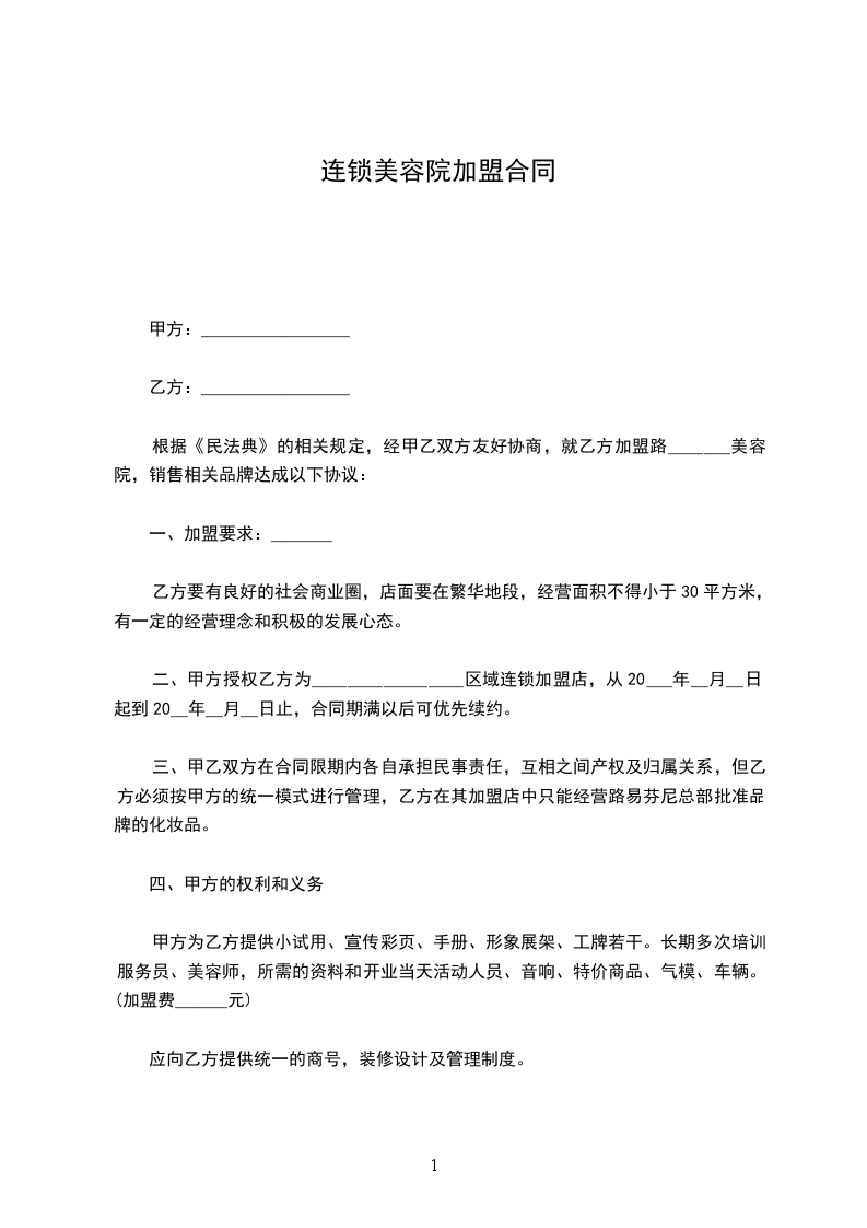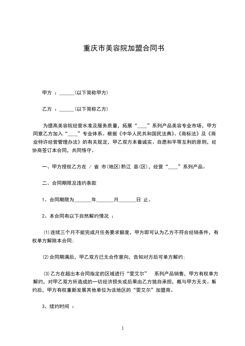 为提高美容院经营水准及服务质量,拓展“____”系列产品美容专业市场,甲方同意乙方加入“____”专业体系。根据《中华人民共和国民法典》、《商标法》及《商业特许经营管理办法》的有关规定,甲乙双方本着诚实、自愿和平等互利的原则,经协商签订本合同,共同恪守。