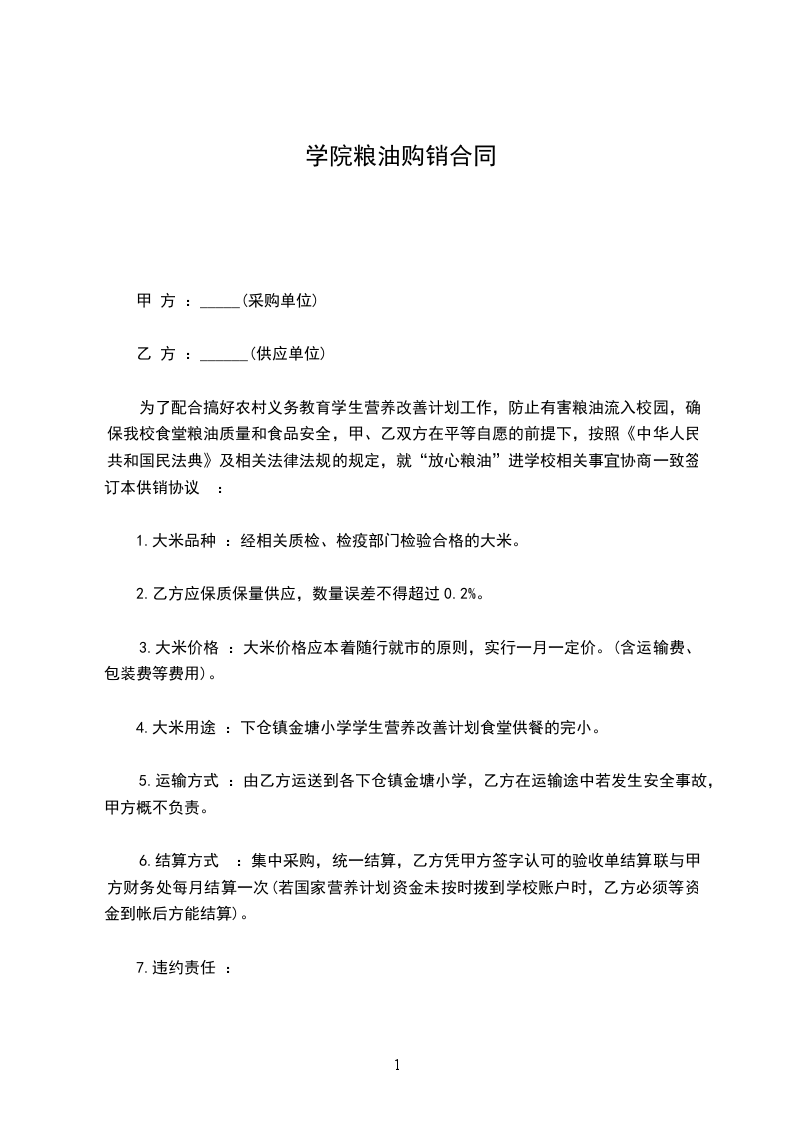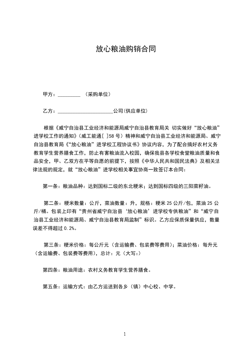 为了配合搞好农村义务教育学生营养改善计划工作,防止有害粮油流入校园,确保我校食堂粮油质量和食品安全,甲、乙双方在平等自愿的前提下,按照《中华人民共和国民法典》及相关法律法规的规定,就“放心粮油”进学校相关事宜协商一致签订本供销协议 :