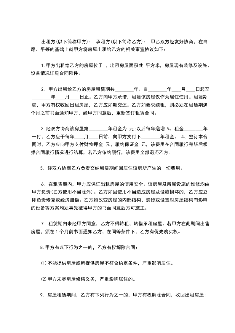 2. 甲方出租给乙方的房屋租赁期共________年。自________年____月____日起至________年____月____日止。乙方向甲方承诺,租赁该房屋仅作为居住使用。租赁期满,甲方有权收回出租房屋,乙方应如期交还。乙方如要求续租,则必须在租赁期满 个月之前书面通知甲方,经甲方同意后,重新签订租赁合同。