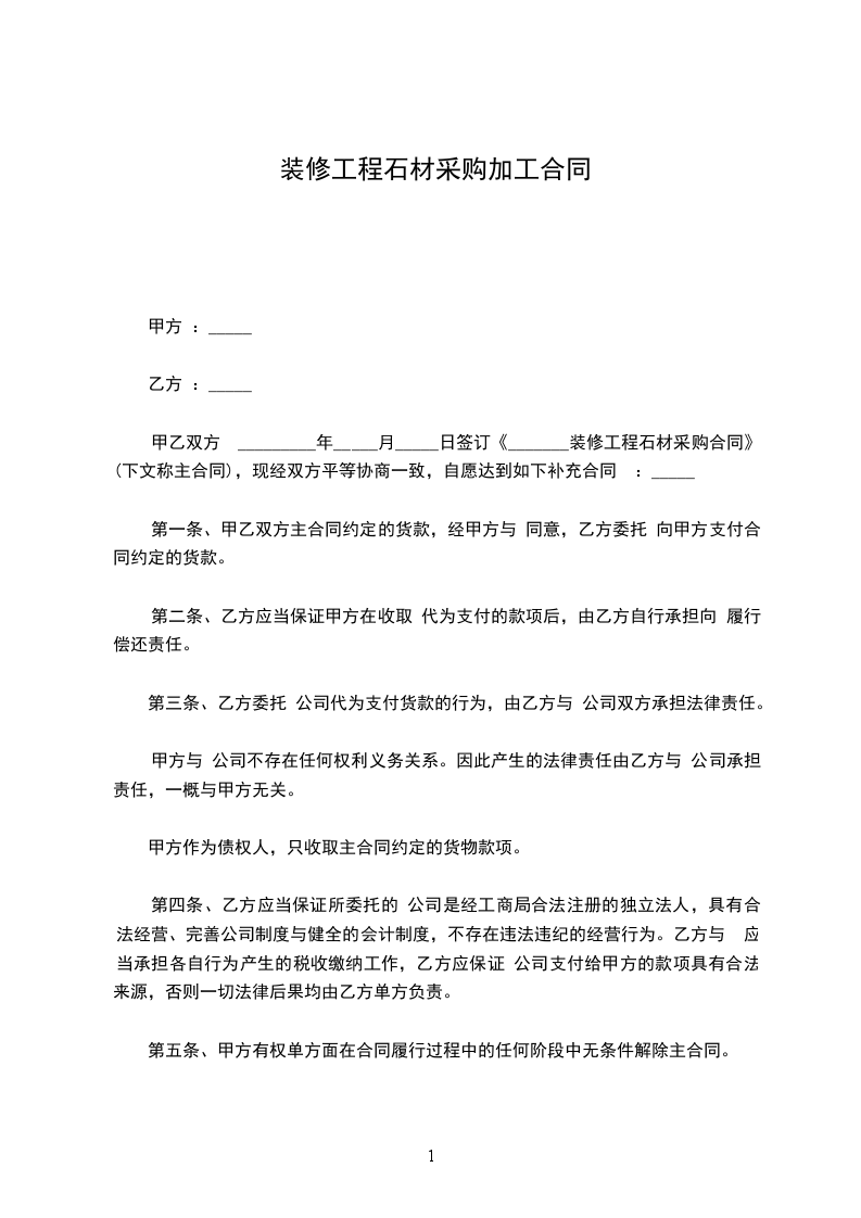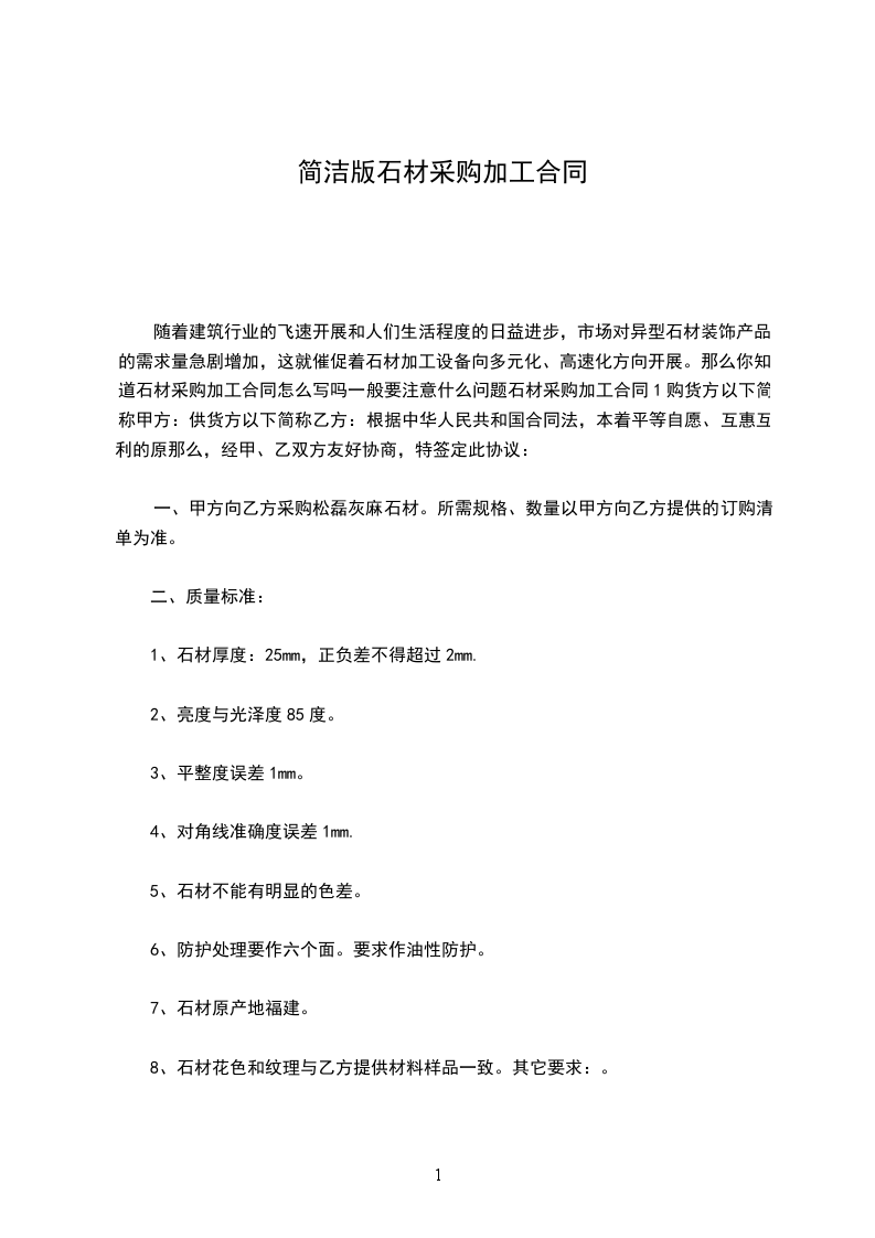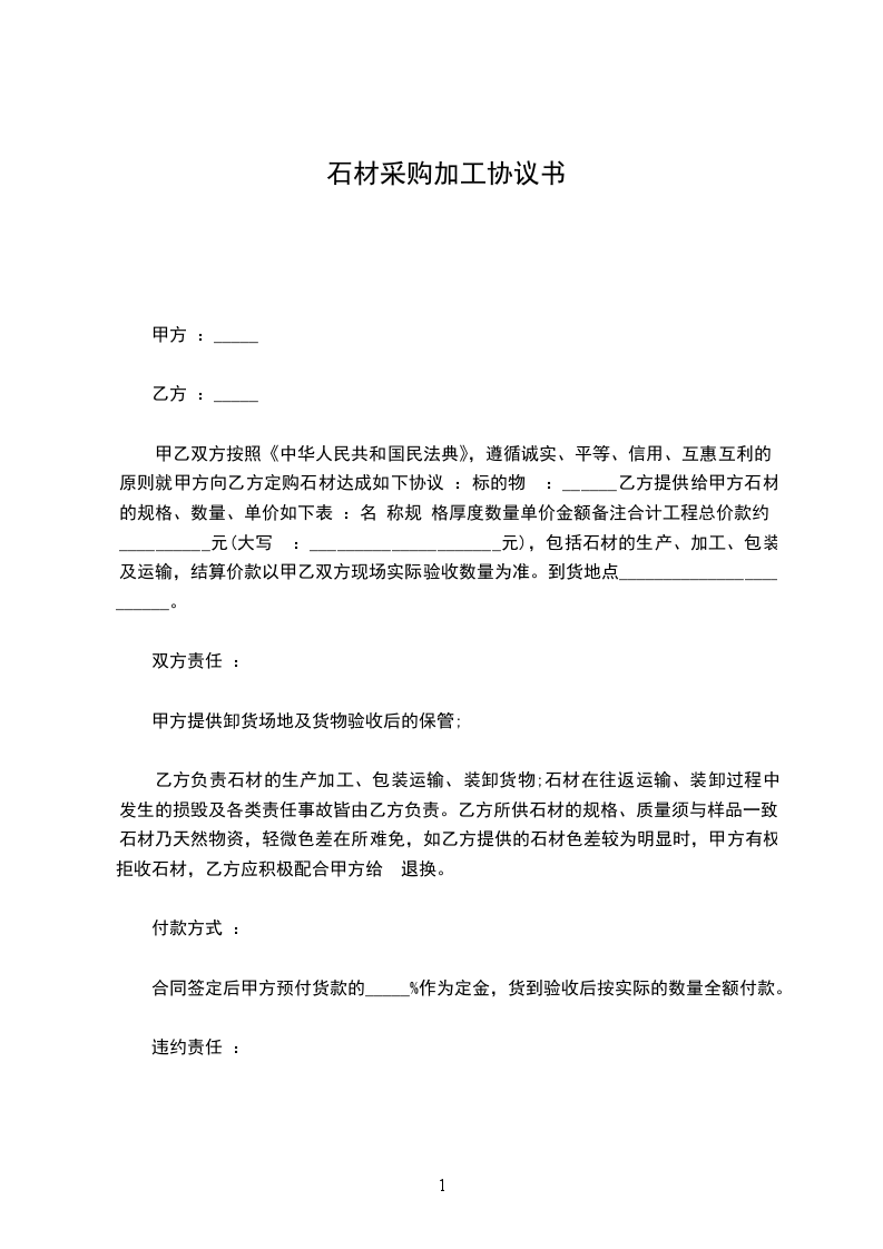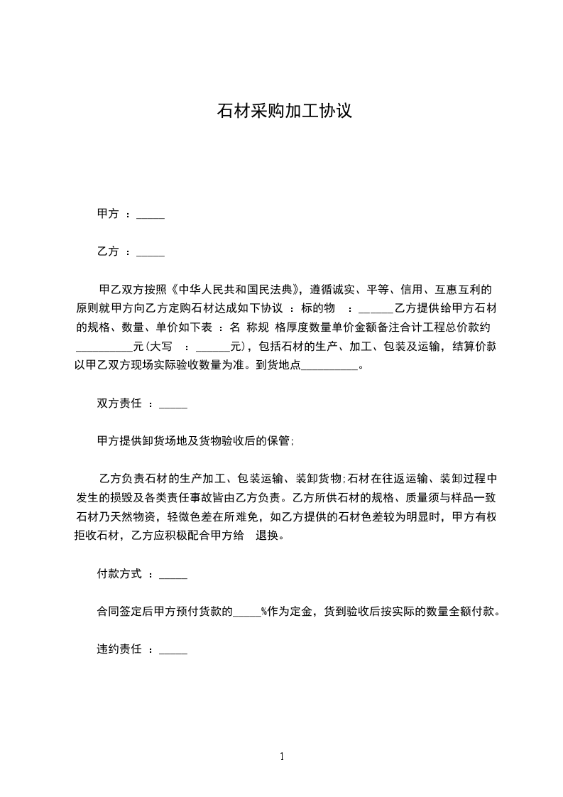 甲乙双方按照《中华人民共和国民法典》,遵循诚实、平等、信用、互惠互利的原则就甲方向乙方定购石材达成如下协议 :标的物 :______乙方提供给甲方石材的规格、数量、单价如下表 :名 称规 格厚度数量单价金额备注合计工程总价款约 :__________元(大写 :_____________________元),包括石材的生产、加工、包装及运输,结算价款以甲乙双方现场实际验收数量为准。到货地点________________________。
