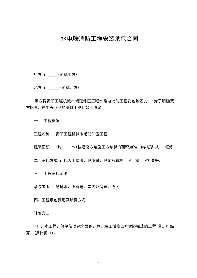 甲方将贵阳工程机械市场配件区工程水暖电消防工程发包给乙方, 为了明确双方职责,在平等互利的基础上签订如下协议