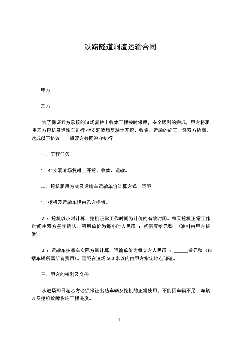 为了保证我方承接的渣场复耕土收集工程按时保质,安全顺利的完成,甲方将租用乙方挖机及运输车进行4#支洞渣场复耕土开挖、收集、运输的施工。经双方协商,达成以下协议 :望双方共同遵守执行