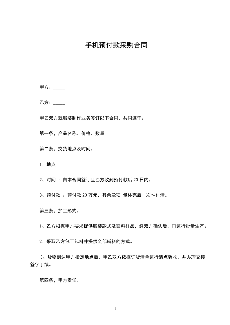 3、预付款 :预付款20万元,其余款项 量体完后一次性付清。