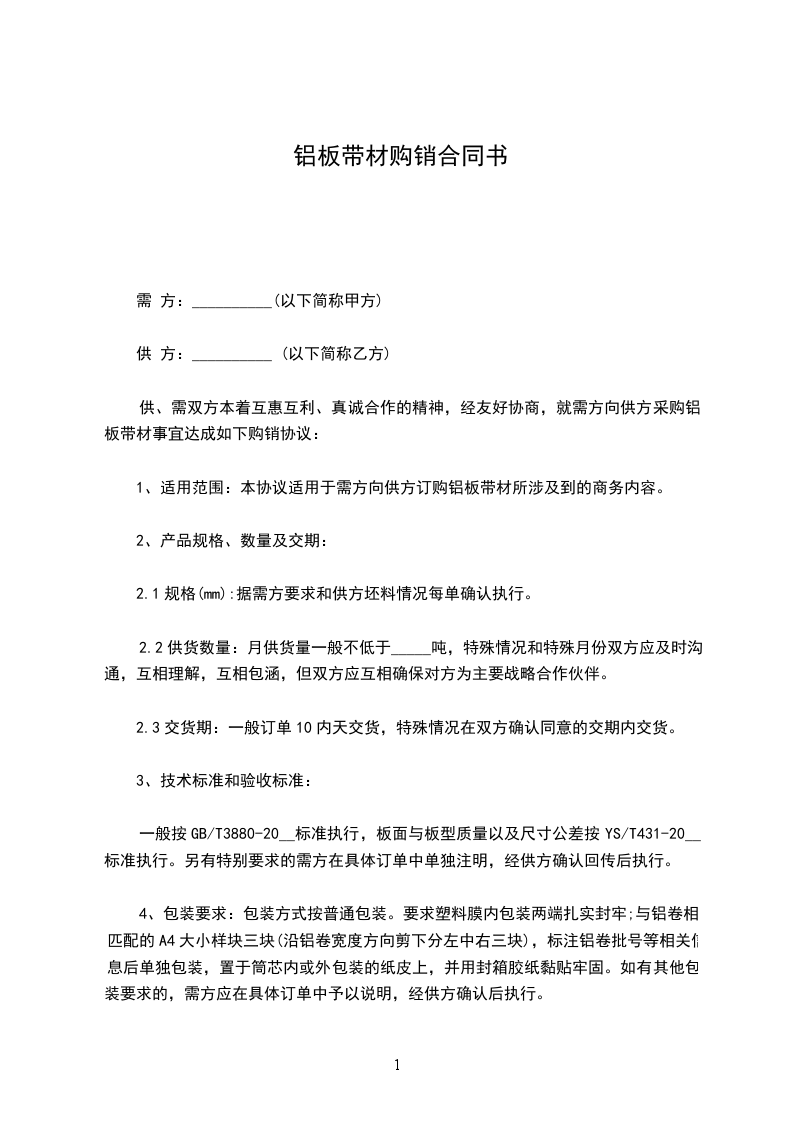 供、需双方本着互惠互利、真诚合作的精神,经友好协商,就需方向供方采购铝板带材事宜达成如下购销协议: