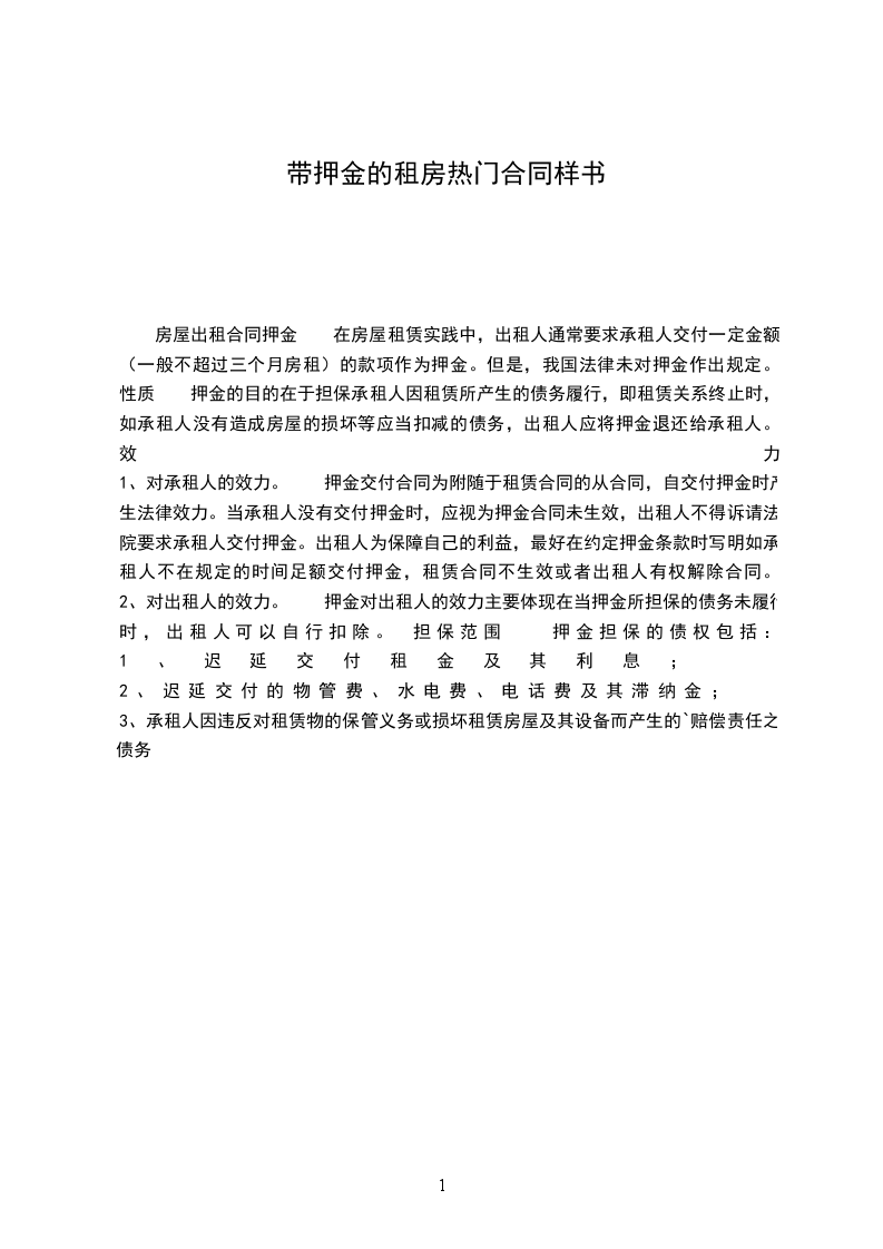 房屋出租合同押金 在房屋租赁实践中,出租人通常要求承租人交付一定金额(一般不超过三个月房租)的款项作为押金。但是,我国法律未对押金作出规定。 性质 押金的目的在于担保承租人因租赁所产生的债务履行,即租赁关系终止时,如承租人没有造成房屋的损坏等应当扣减的债务,出租人应将押金退还给承租人。 效力