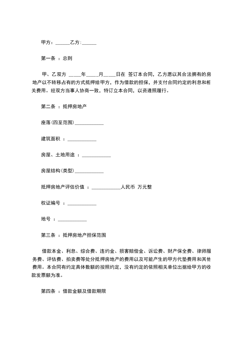 甲、乙双方 _____年_____月_____日在 签订本合同,乙方愿以其合法拥有的房地产以不转移占有的方式抵押给甲方,作为借款的担保,并支付合同约定的利息和相关费用。经双方当事人协商一致,特订立本合同,以资遵照履行。