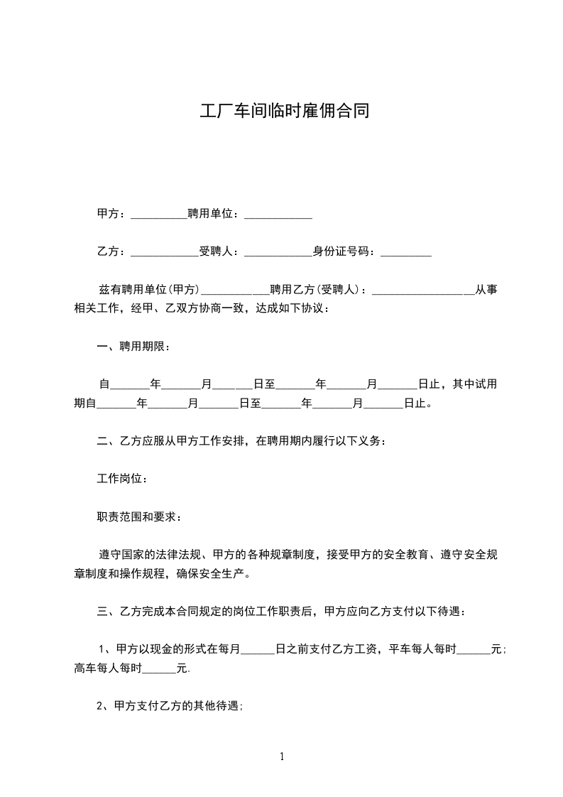 1、甲方以现金的形式在每 月之前支付乙方工资, 平车每人每时 元。高车每人每时 元。