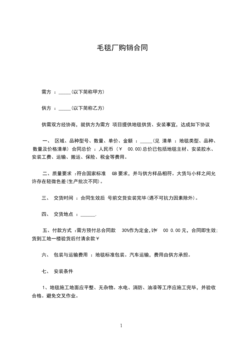 一、 区域、品种型号、数量、单价、金额 :_____(见 清单 :地毯类型、品种、数量及价格清单) 合同总价 :人民币 (¥ 00.00)总价已包括地毯主材、安装胶水、安装工费、运输、搬运、保险、税金等费用。