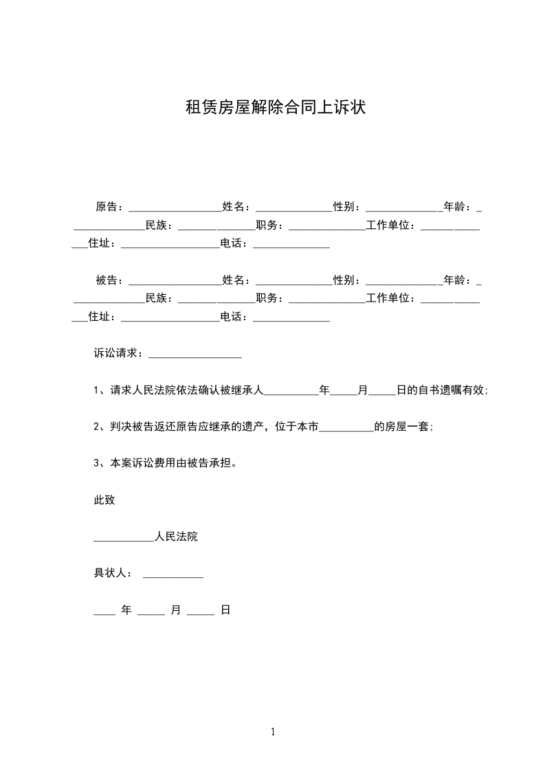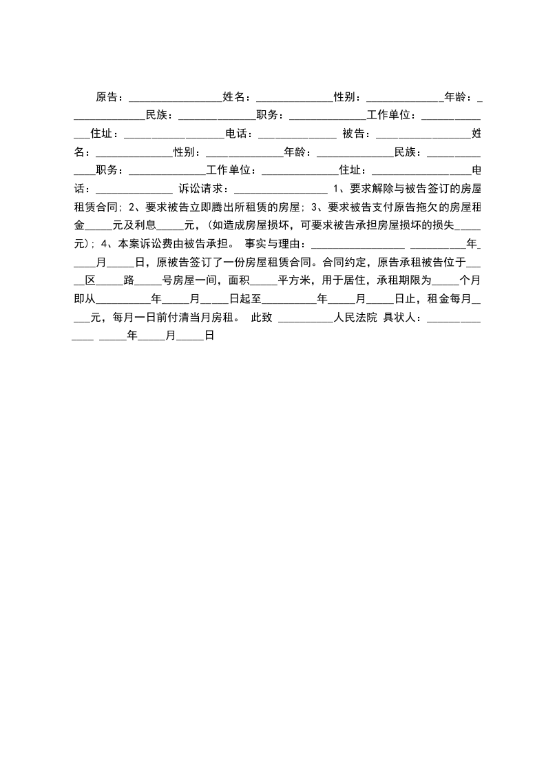 原告:,住所地:,法定代表人:。 被告:,男,________年____月____日出生,身份证号码:,住所地:。 案由:房屋租赁合同纠纷 诉讼请求: