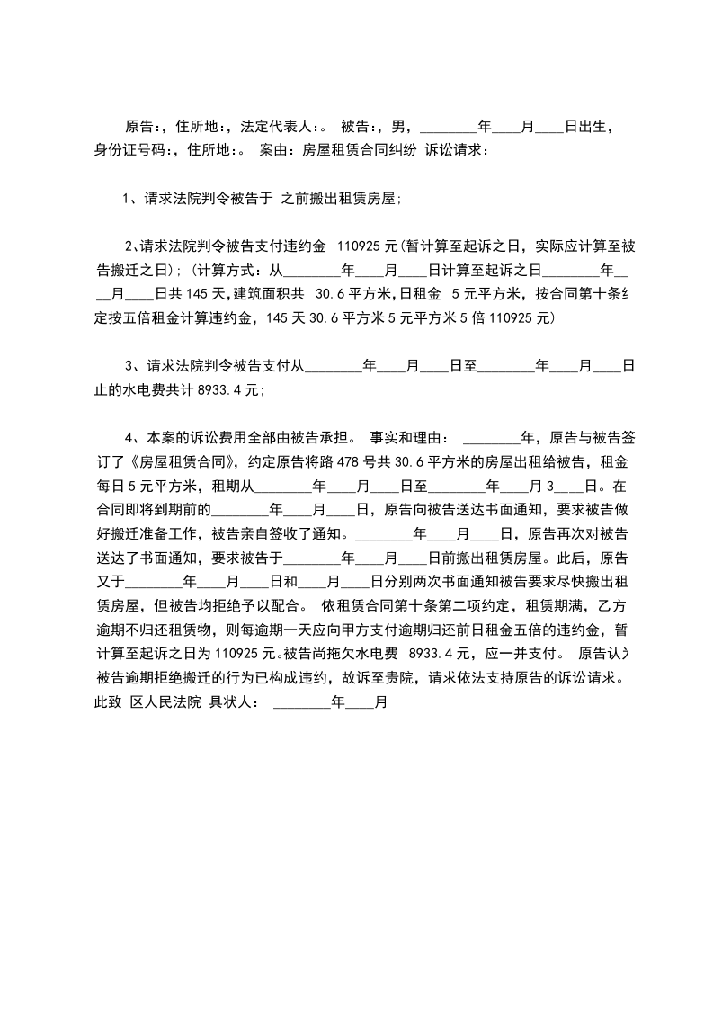 4、本案的诉讼费用全部由被告承担。 事实和理由: ________年,原告与被告签订了《房屋租赁合同》,约定原告将路478号共30.6平方米的房屋出租给被告,租金每日5元平方米,租期从________年____月____日至________年____月3____日。在合同即将到期前的________年____月____日,原告向被告送达书面通知,要求被告做好搬迁准备工作,被告亲自签收了通知。________年____月____日,原告再次对被告送达了书面通知,要求被告于________年____月____日前搬出租赁房屋。此后,原告又于________年____月____日和____月____日分别两次书面通知被告要求尽快搬出租赁房屋,但被告均拒绝予以配合。 依租赁合同第十条第二项约定,租赁期满,乙方逾期不归还租赁物,则每逾期一天应向甲方支付逾期归还前日租金五倍的违约金,暂计算至起诉之日为110925元。被告尚拖欠水电费8933.4元,应一并支付。 原告认为,被告逾期拒绝搬迁的行为已构成违约,故诉至贵院,请求依法支持原告的诉讼请求。 此致 区人民法院 具状人: ________年____月