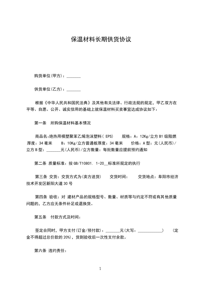 根据《中华人民共和国民法典》及其他有关法律、行政法规的规定,甲乙双方在平等、自愿、公开、诚实信用的基础上就保温材料买卖事宜达成协议如下: