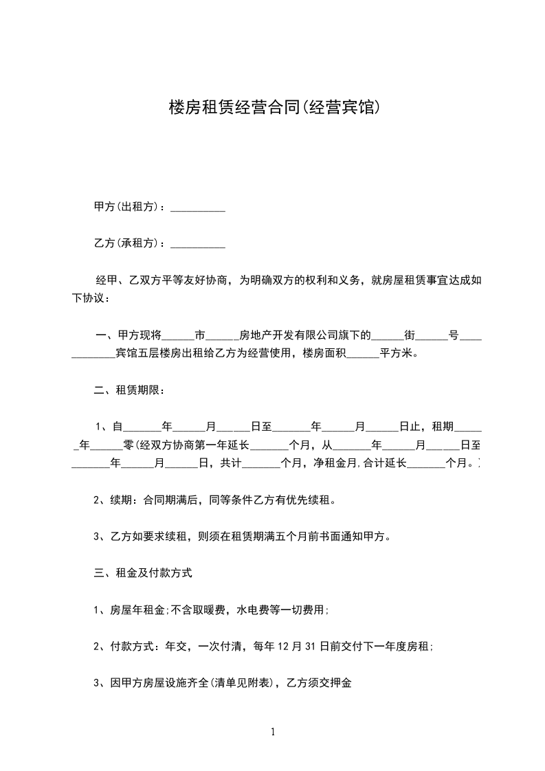 一、甲方现将______市______房地产开发有限公司旗下的______街______号____________宾馆五层楼房出租给乙方为经营使用,楼房面积______平方米。