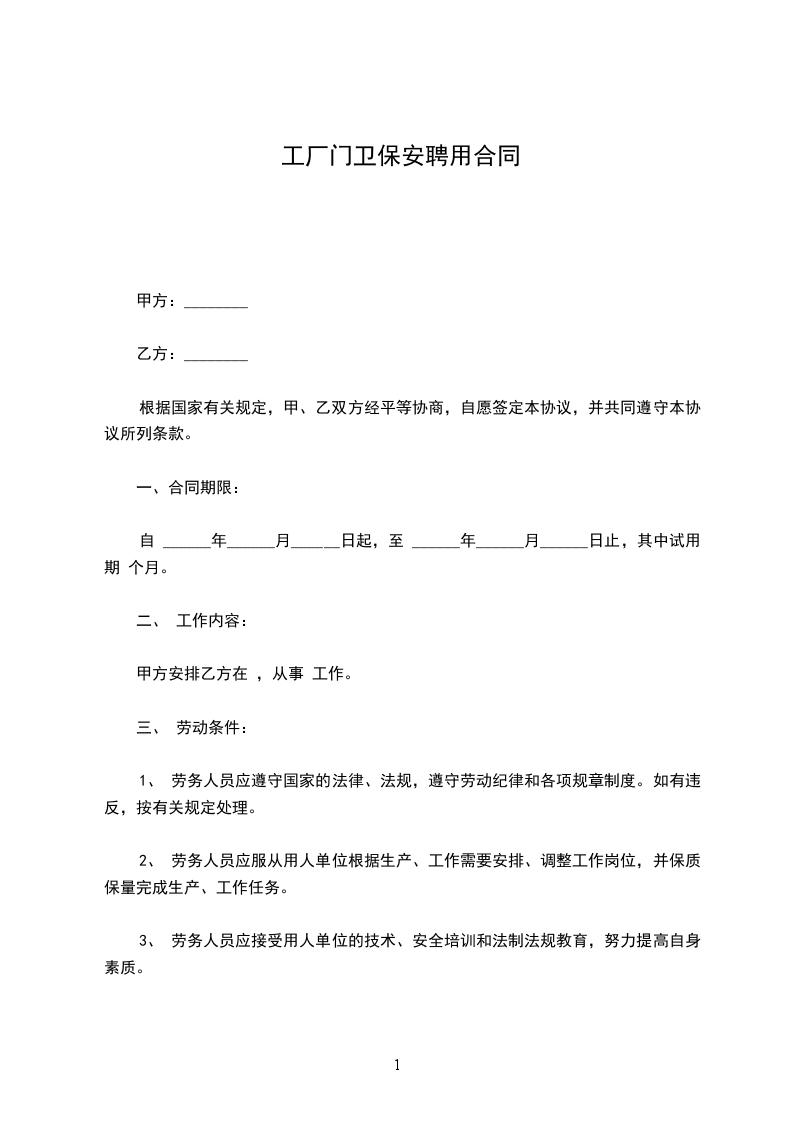 3、 因乙方岗位为保安,每天工作时间为1