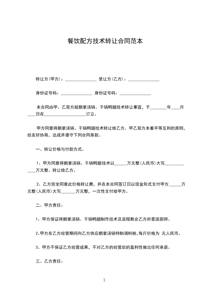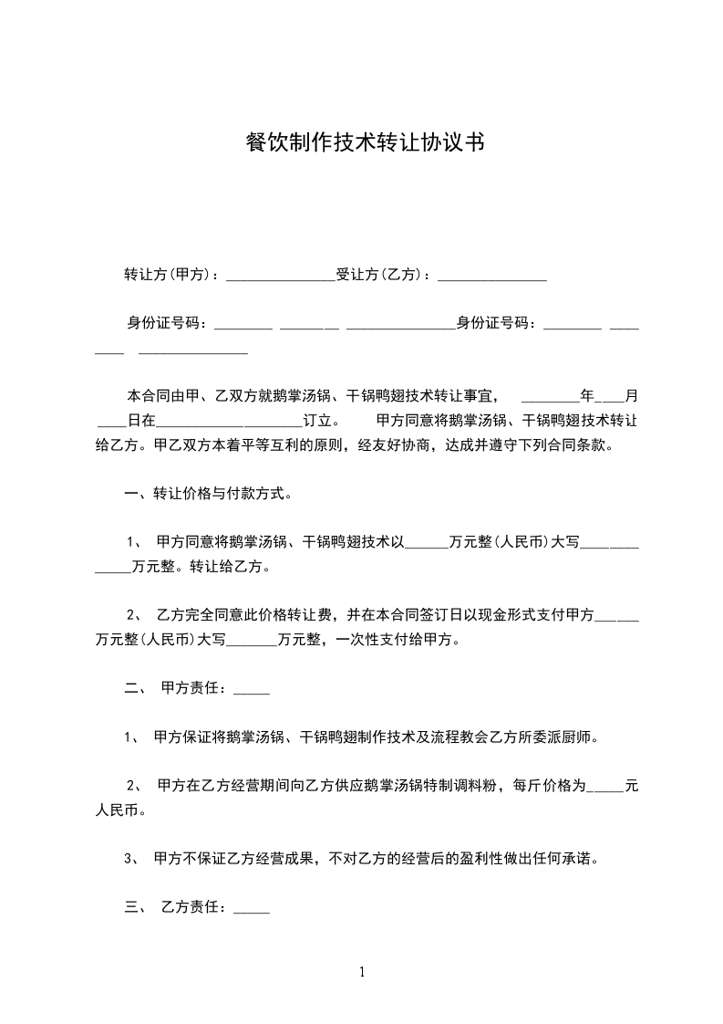 1、 甲方同意将鹅掌汤锅、干锅鸭翅技术以______万元整(人民币)大写_____________万元整。转让给乙方。