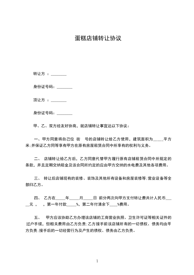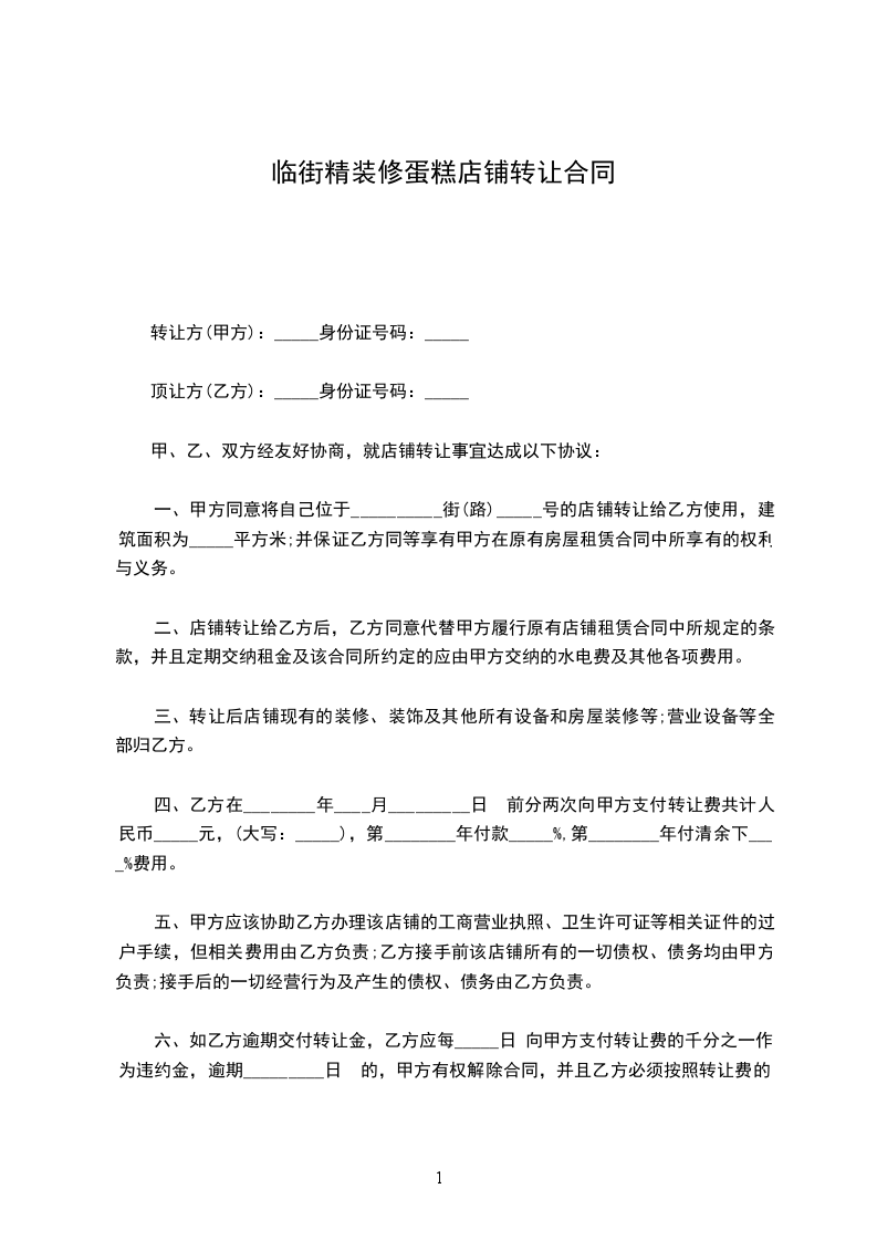 四、乙方在____________年_________月________日前一次性向甲方支付转让费共计人民币________元,(大写:________________),上述费用已包括第三条所述的装修、装饰、设备及其他相关费用,此外甲方不得再向乙方索取任何其他费用。