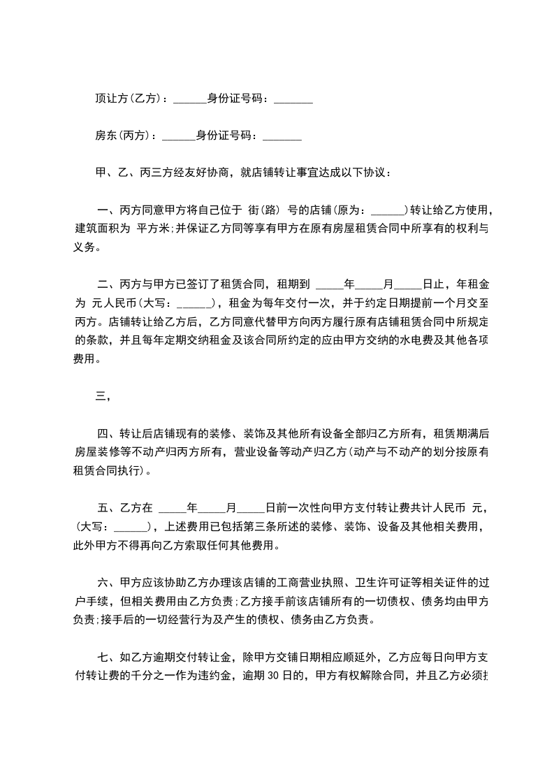 甲、乙、丙三方经友好协商,就店铺转让事宜达成以下协议: