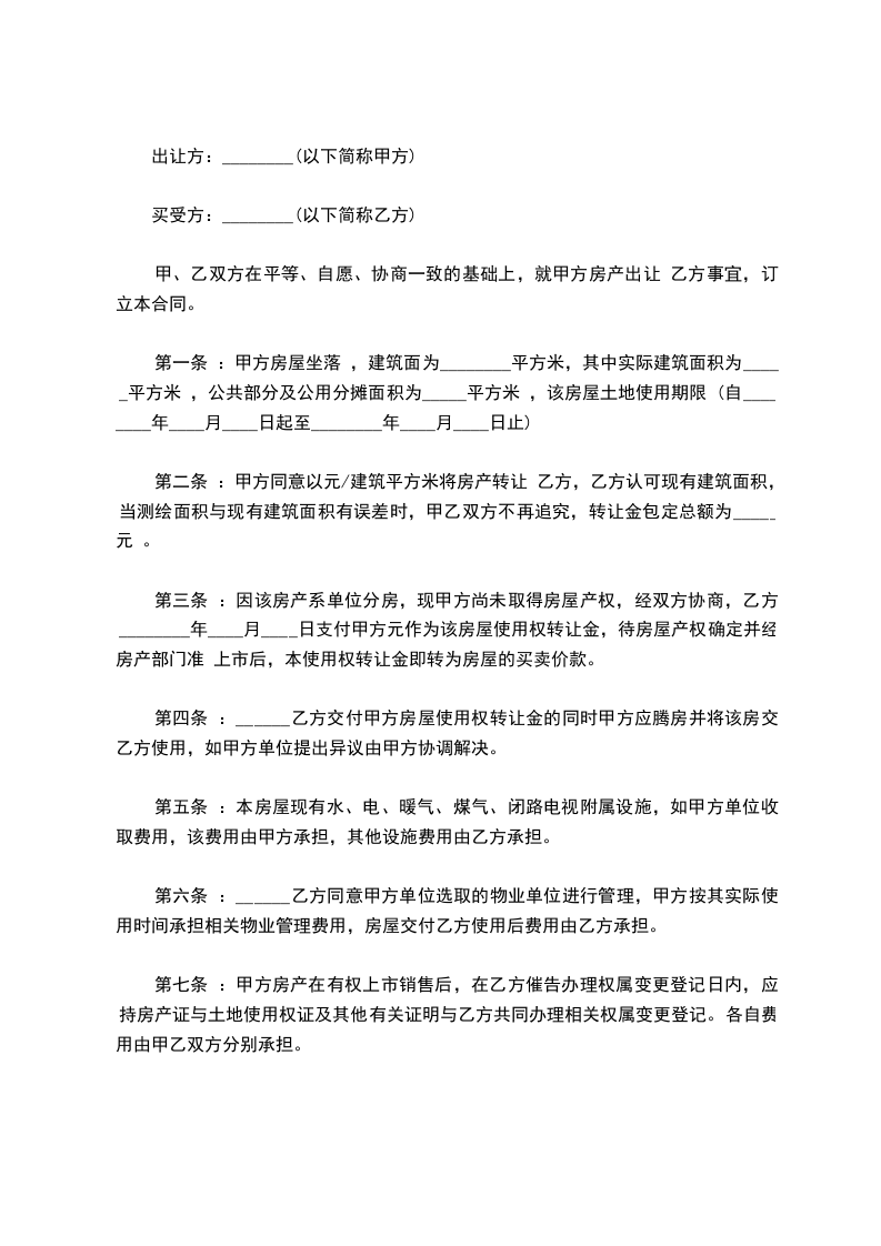 第一条 :甲方房屋坐落 ,建筑面为________平方米,其中实际建筑面积为_____平方米 ,公共部分及公用分摊面积为_____平方米 ,该房屋土地使用期限 (自________年____月____日起至________年____月____日止)