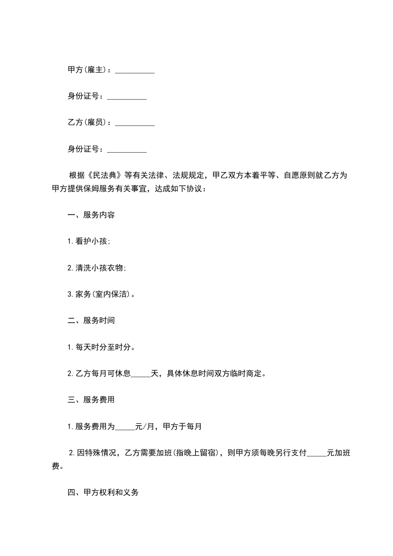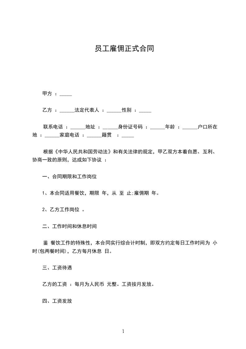 八、本合同未尽事宜,按现行法律法规执行。本合同一式两份,甲乙双方各执一份。 甲方:(盖章) 乙方:(签名) 法定代表人(主要负责人)________年____月____日________年____月____日 餐饮业简单雇佣合同范本 甲方(用人单位)名称: 法定代表人(主要负责人)或者委托代理人: 注册地址: 联系电话: 乙方(劳动者)姓名: 居民身份证号: 户口所在地: 省(市) 区(县) 乡镇 村 XX编码: 现住址: 联系电话: 根据《劳动法》、《劳动合同法》及有关规定,甲乙双方遵循平等自愿、协商一致的原则签订本合同。